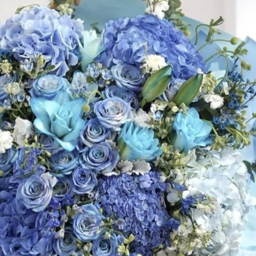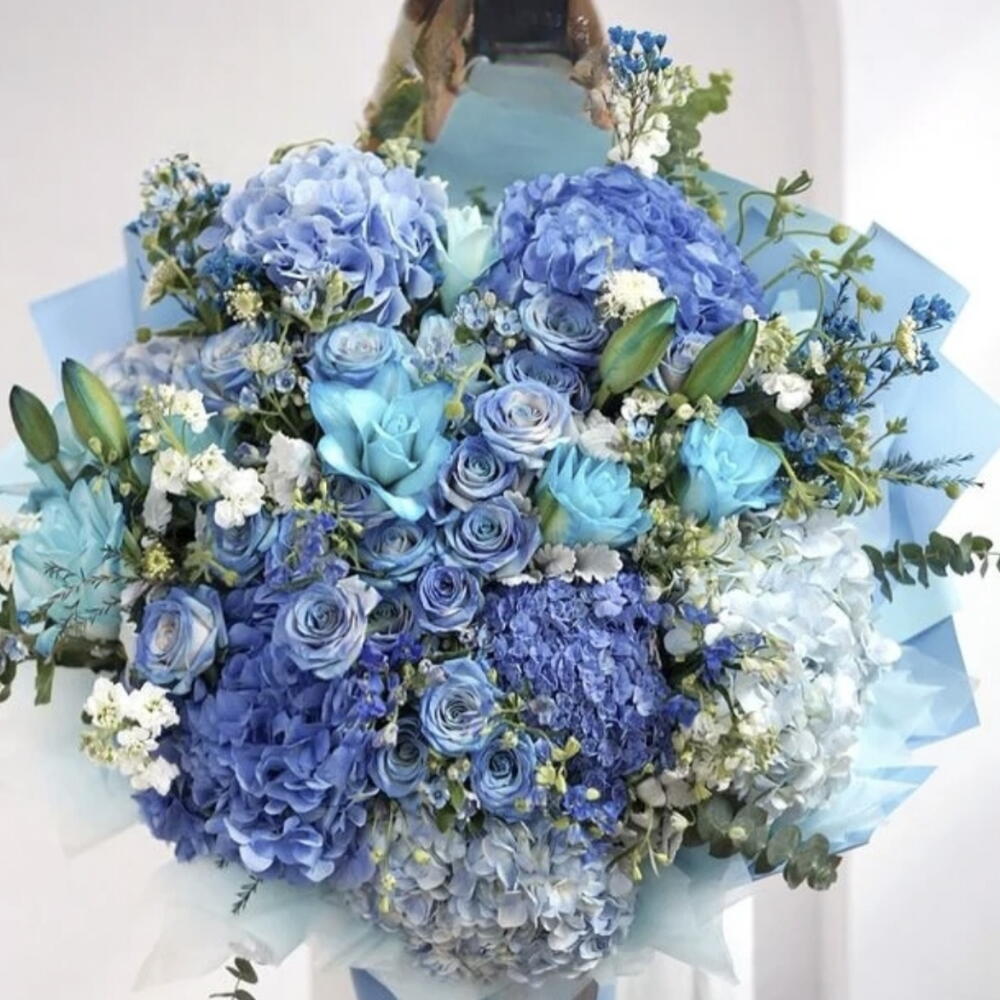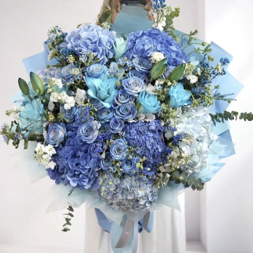 Blue Lily Blue Hydrangeas Fresh Flower Gift Bouquet is a floral arrangement that features a variety of blue flowers, including what appear to be lilies, hydrangeas, and roses, with white filler flowers and green foliage. The bouquet is wrapped in light blue paper and tied with a ribbon. The combination of these flowers creates a cool-toned, elegant, and serene aesthetic. Blue hydrangeas can symbolize gratitude and apology, while blue roses often represent inspiration, mystery, and rare elegance. This type of bouquet is often given for special occasions such as birthdays, anniversaries, weddings, or as a congratulatory gift.