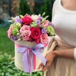 Composition: Lisianthus - 3, Viburnum - 1, Spray Rose Snowy blossom - 1, Rose red - 3, Eucalyptus - 1, Rose sprey Madame Bombastic - 2, box - 1, ribbon - 2 Sizes: WIDTH - 20CM; HEIGHT - 25CM; LENGTH - 25CM; (including packaging) Size: 20 x 25 x 25 cm