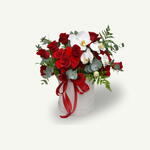 A mixture of 25–30 red roses, eucalyptus, 4 fern leaves, and a white orchid stem gently crafted in a white velvet box for a bold and graceful floral statement.
