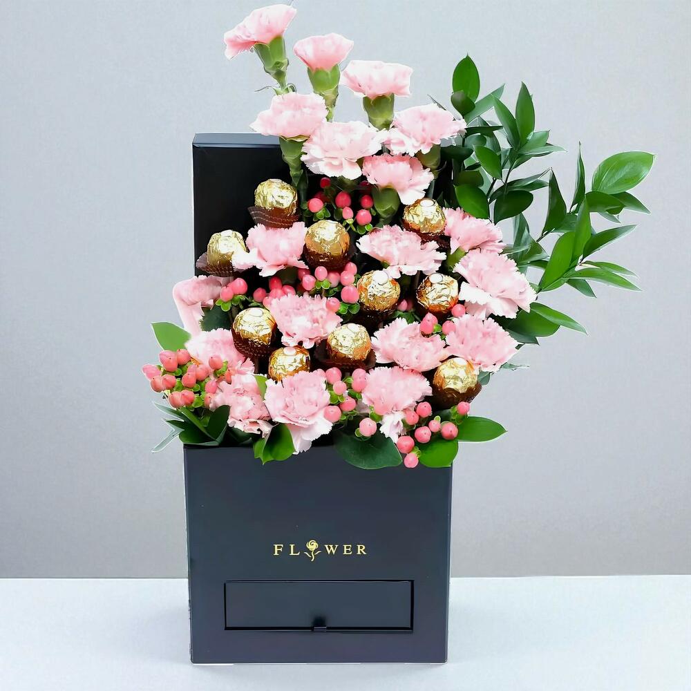 pink carnations - 20 pcs ferrero rocher chocolates - 10 pcs black square box - 1 pcs pink hypericum berry - 1 pcs