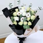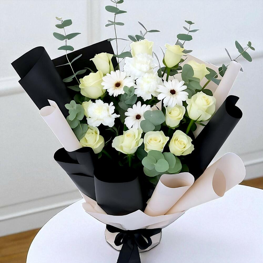 An elegant arrangement of white roses and soft seasonal blooms, wrapped in luxurious black and beige paper. Perfect for formal occasions and refined visits, it conveys purity and appreciation with a touch of sophistication