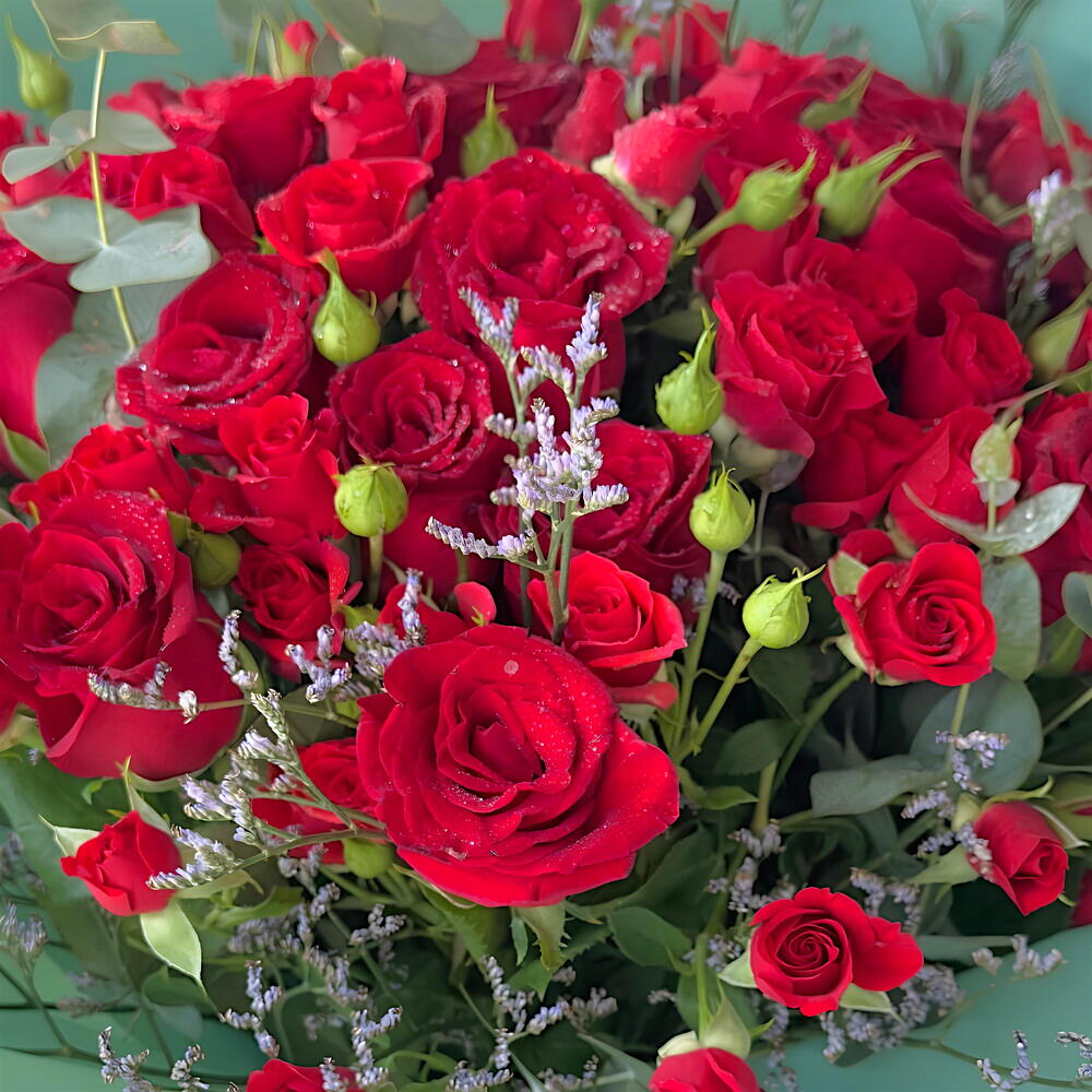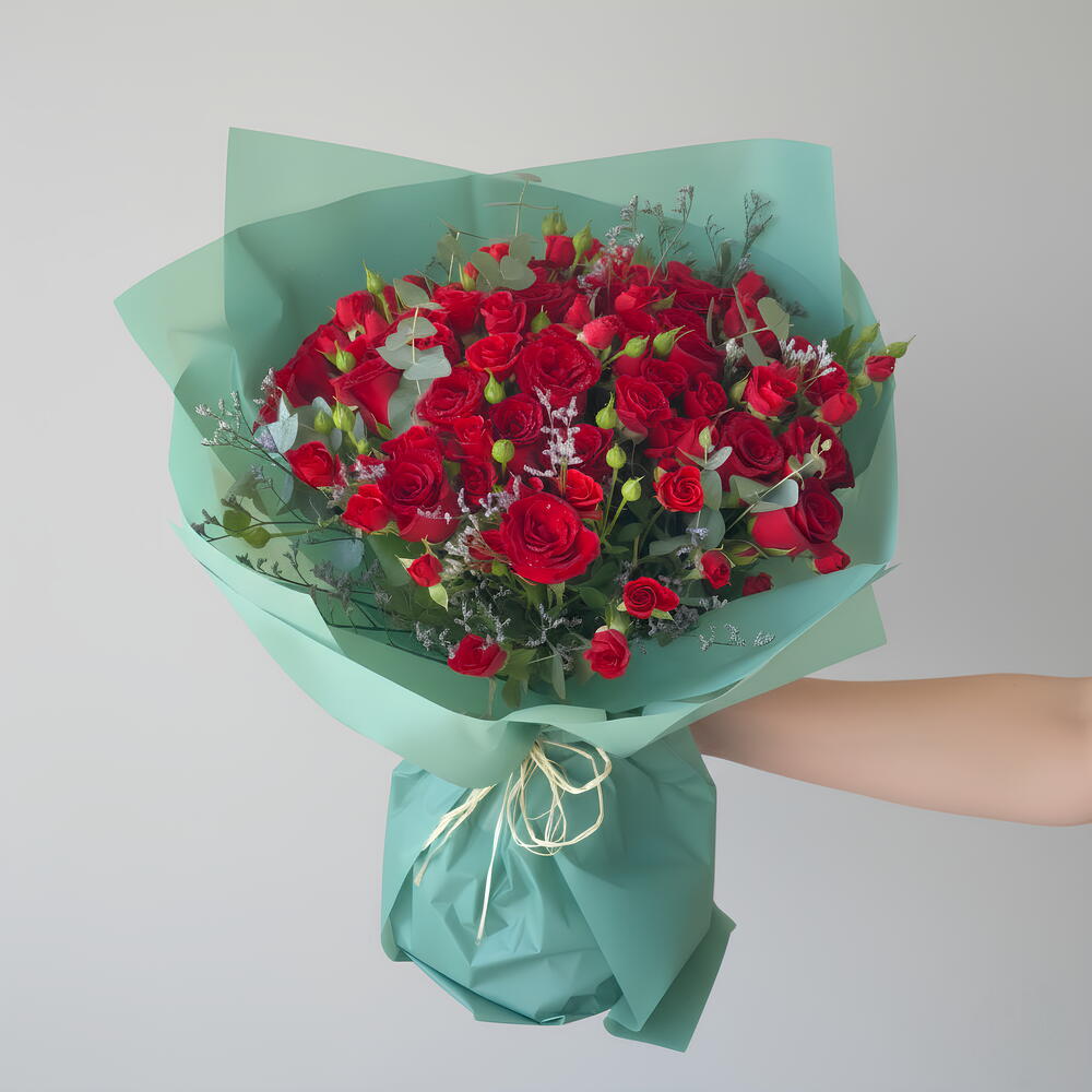 an exquisite composition of 31 deep red roses and 20 radiant red spray roses, a true floral masterpiece that embodies passion, romance, and timeless elegance. Wrapped in rich green paper, this bouquet strikes the perfect harmony between romantic intensity and refined sophistication, making it an unforgettable gift for: ❤️ Anniversaries 💍 Proposals 💘 Valentine’s Day 💌 Grand romantic gestures Crafted to captivate at first glance and leave a lasting impression, Alaya Simfoniya speaks directly to the heart with bold elegance. ✔️ Includes 31 red roses + 20 spray roses ✔️ Wrapped in deep green for a bold, luxurious finish ✔️ Same-day delivery available across Dubai 🌹❤️ Speak the language of love with grandeur order Alaya Simfoniya today with same-day Dubai delivery!