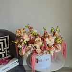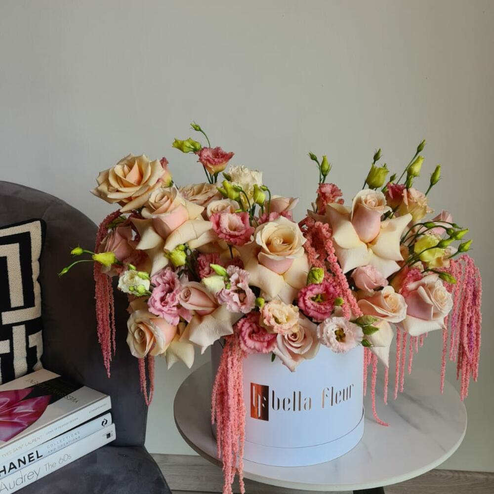 Lisianthus - 10 pcs rose - 25 pcs white large bella box - 1 pcs preserved amaranthus - 4 pcs