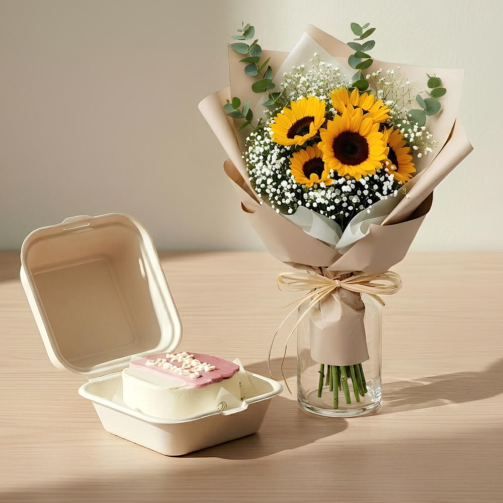 Our Bento Cake + Sunflower Set is made to spark smiles—literally. Welcome to the Smiling Challenge—where sweet cake, bright blooms, and a custom message card team up to turn anyone’s day into a cheerful celebration. 🌻 What’s Inside: Cloud-soft Bento Cake Vanilla sponge baked at dawn for that heirloom crumb. Topped with silky cream-cheese frosting, hand-piped with your own custom message—or a smiley face 😊 (you choose the vibe). 5 Golden Sunflowers Bright, bold, and full of positive energy. Each stem is a little piece of sunshine, bundled up in a bouquet that’s made to lift spirits. Custom Smiley Message Card Every box includes a hand-signed message card featuring your personalised note and a cheerful smile emoji—because happiness should be shared.
