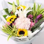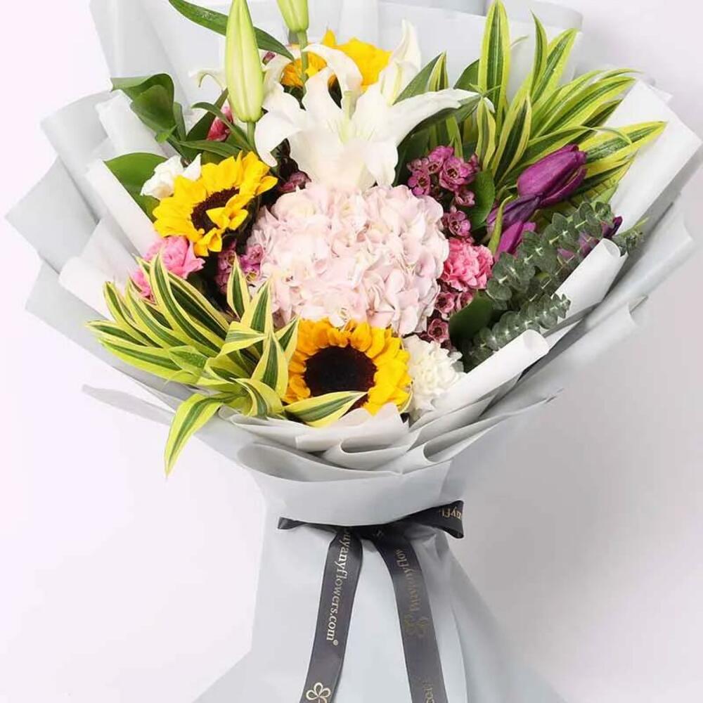 3 Sunflowers 1 Stem White Oriental Lily 1 Pink Hydrangea 4 Purple Tulips 3 Pink and 3 White Carnations 1 Stem Purple Wax Flowers Leaves - 1 Eucalyptus, 2 Song of India and 3 Single Ruscus Grey and White Wrapping and a Ribbon Bow
