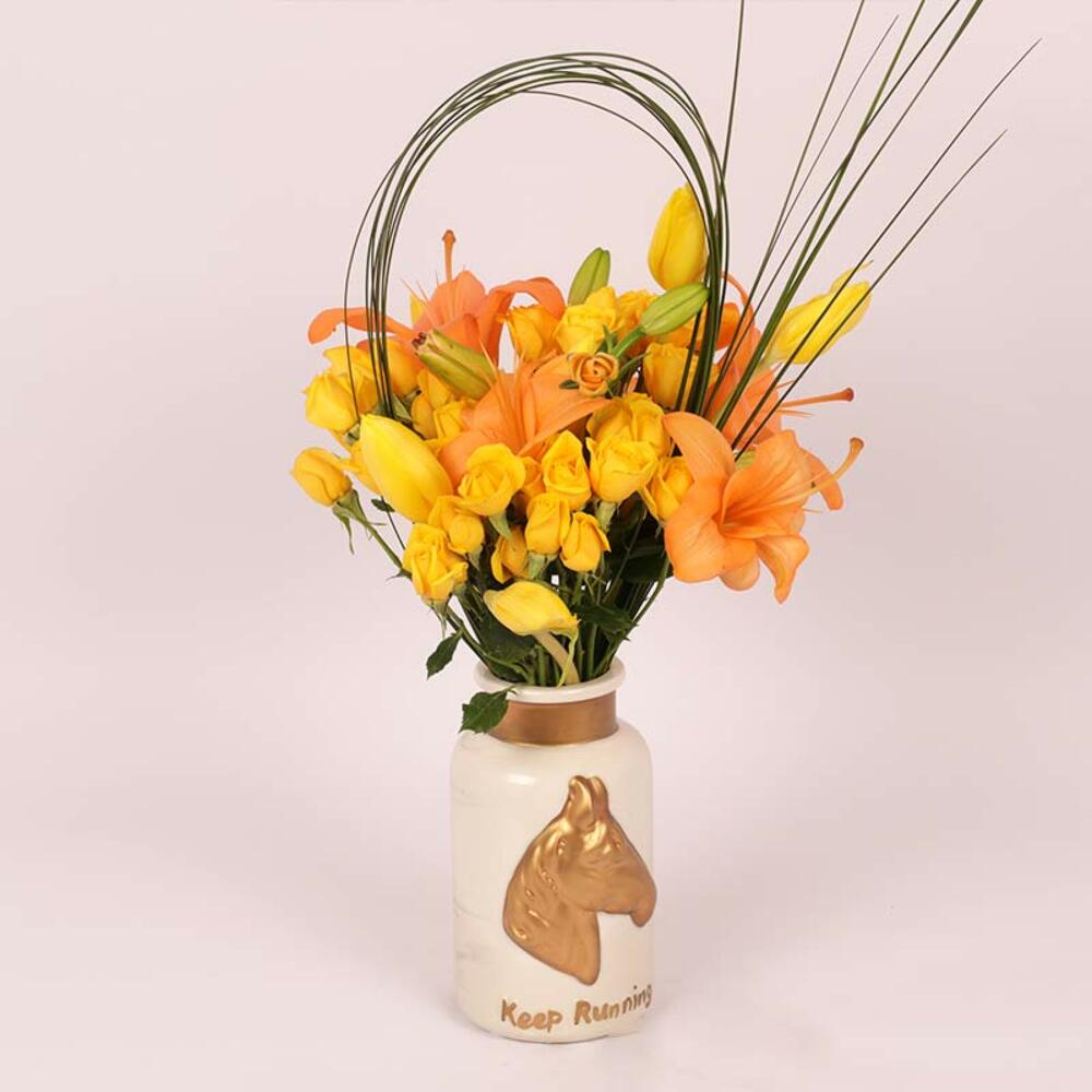 yellow tulips - 4 pcs yellow baby rose - 5 pcs steel grass - 7 pcs orange asiatic lilies - 2 pcs ceramic glass vse - 1 pcs