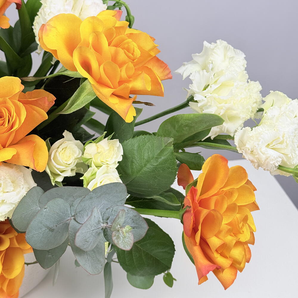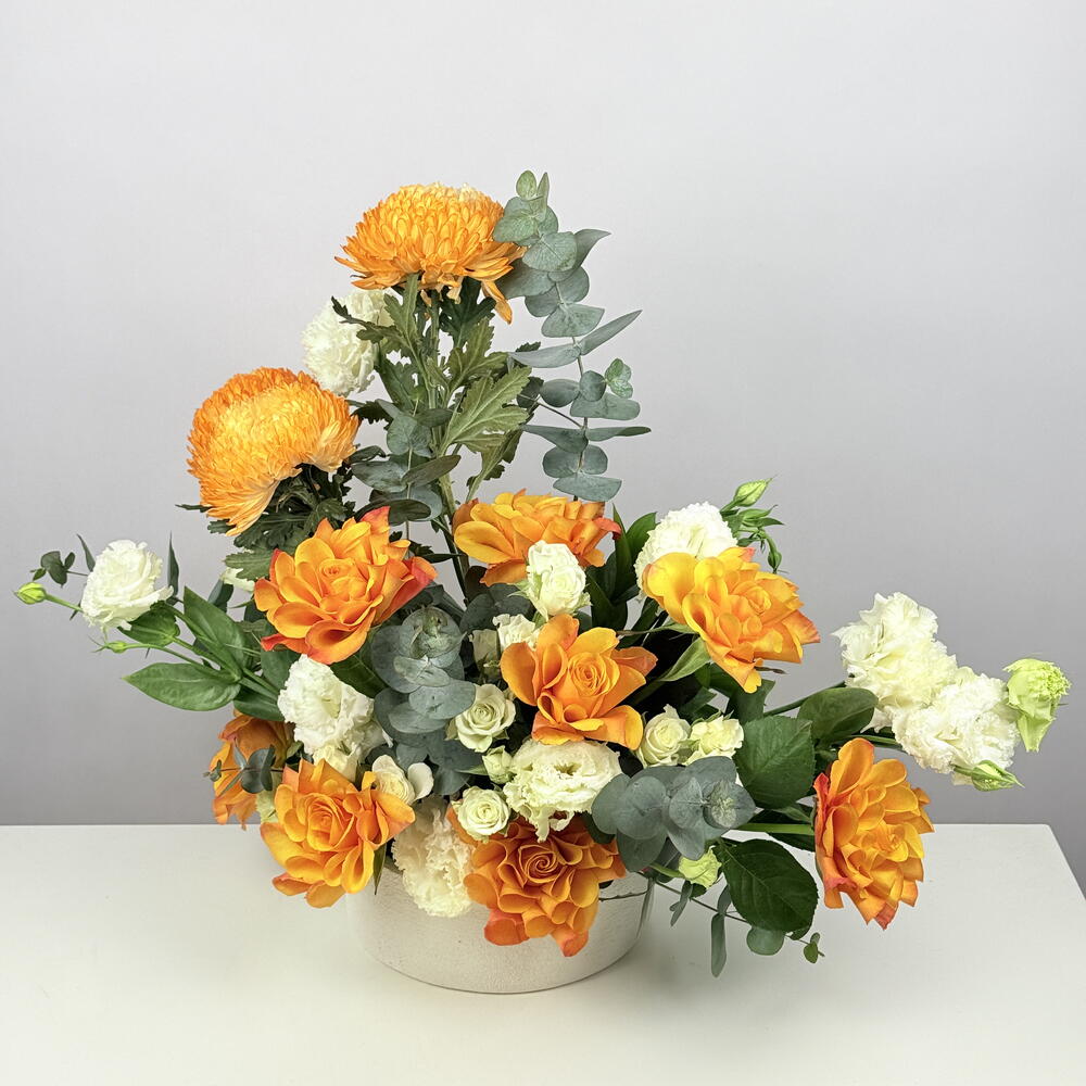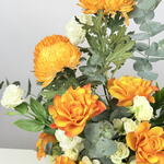 Eustoma white - 3 pcs rose orange - 8 pcs ceramic vase - 1 pcs spray rose white - 5 pcs leaves and others. - 5 pcs deco chry orange - 3 pcs