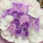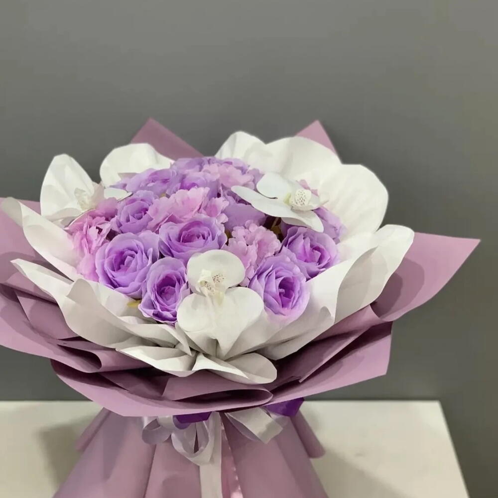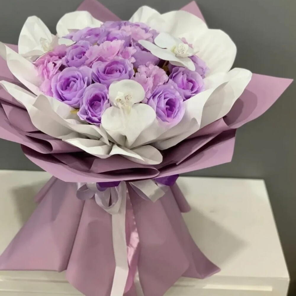 The arrangement features light purple roses and white orchids wrapped in lavender and white paper. Soap flowers are artificial flowers made from soap ingredients that can last for a long time, often for years, if kept away from direct sunlight and moisture. They are frequently used as a long-lasting alternative to fresh flowers for gifts and home decor. Bouquets containing soap roses and orchids are available for various occasions, including birthdays, anniversaries, and Valentines Day. This type of bouquet combines the delicate appearance of orchids, which symbolize love and elegance, with purple roses, which can represent deep admiration and a soulful connection. The wrapping style, often referred to as Korean wrapping, uses multiple layers of paper to create a full, voluminous look.
