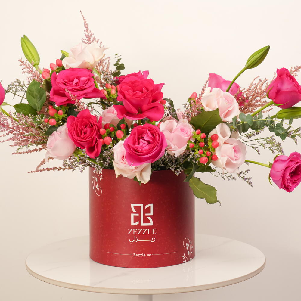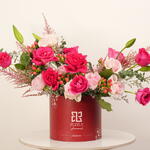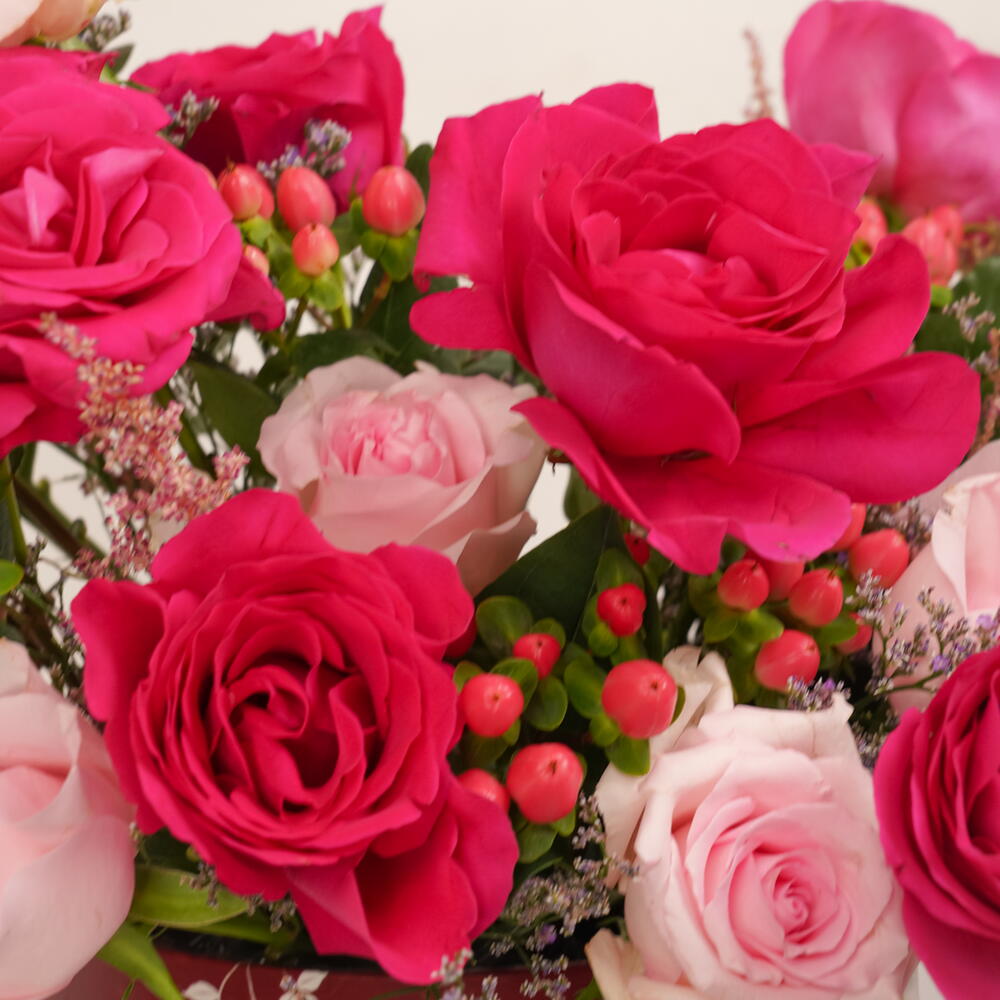 Immerse yourself in the splendor of our Flowers in a Box arrangement. Hand-picked for their exceptional freshness and quality, this display boasts 10 exquisite white lilies, exuding purity and elegance. They are complemented by 10 soft pink roses and 10 vibrant fuchsia roses, forming a delightful blend of colors and textures. The arrangement is further enhanced with 5 striking red hypericums and an infusion of astilbe pink and Limonium purple - each contributing 5 pieces. This fantastic ensemble of blooms promises a compelling visual appeal and an enchanting fragrance, making it a perfect choice for decor or a charming gift.