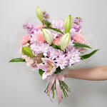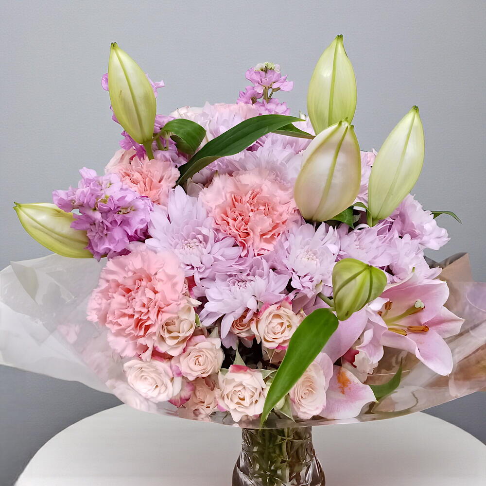 carnation pink - 6 pcs lily pink - 3 pcs baby rose pink - 3 pcs chrysanthemum light purple - 5 pcs matthiola pink - 3 pcs