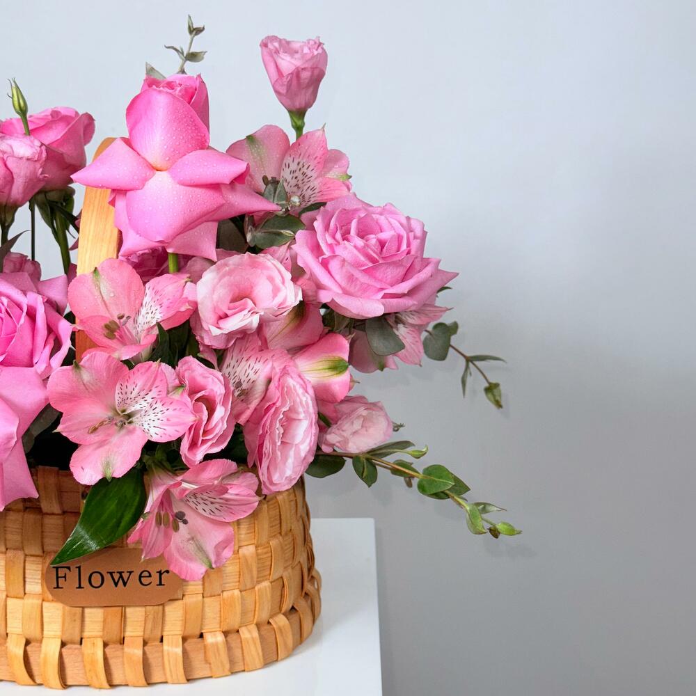 Eucalyptus - 3 pcs bamboo basket - 1 pcs revival rose - 7 pcs Lisianthus alissa - 3 pcs alstroemeria pink - 5 pcs