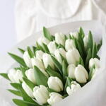 Bouquet: A large, elegant bouquet composed of numerous fresh white tulips with vibrant green leaves, wrapped in soft white paper and tied with a white ribbon. White tulips typically symbolize purity, new beginnings, and sincere emotions. Chocolates: A white box of Raffaello Confetteria