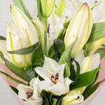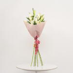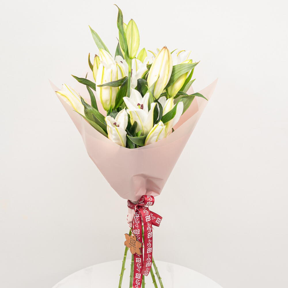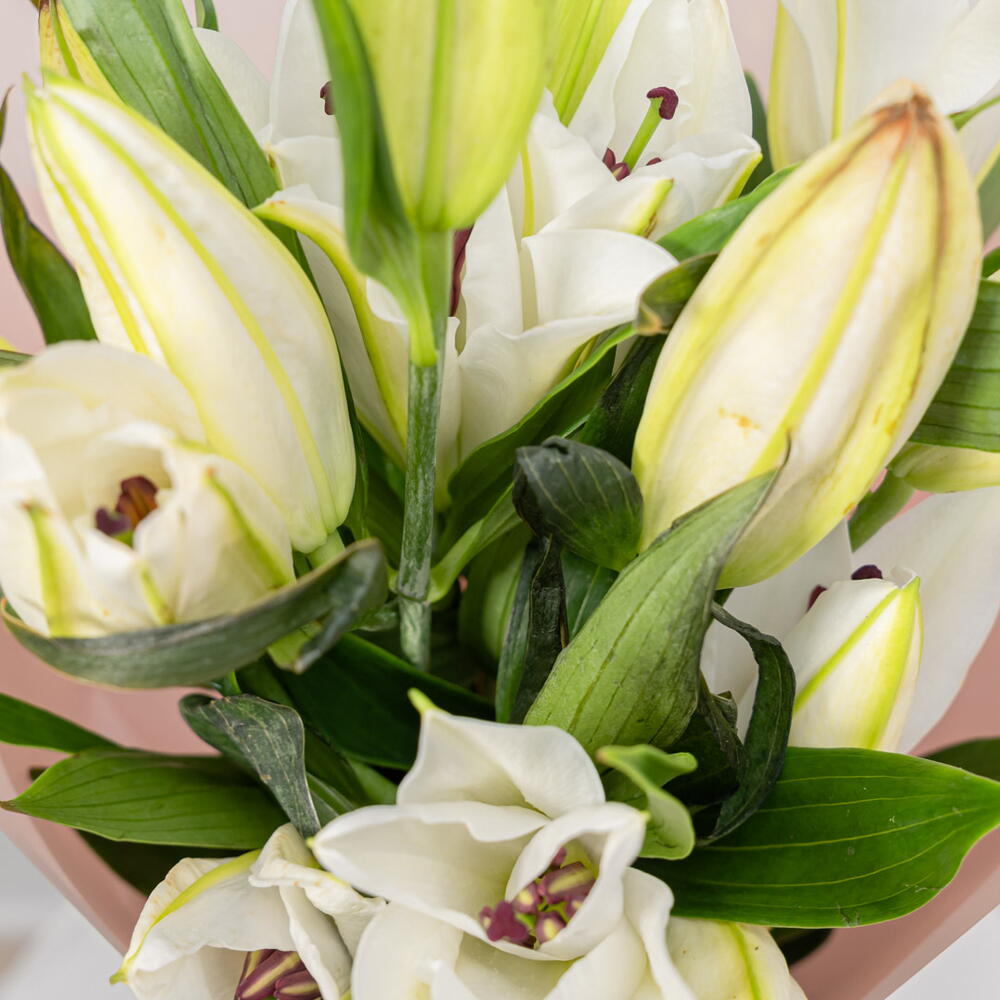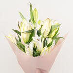 A vision of white unfolds in this elegant bouquet of ten pristine lilies. Their stately blooms and delicate fragrance create an atmosphere of purity and grace