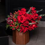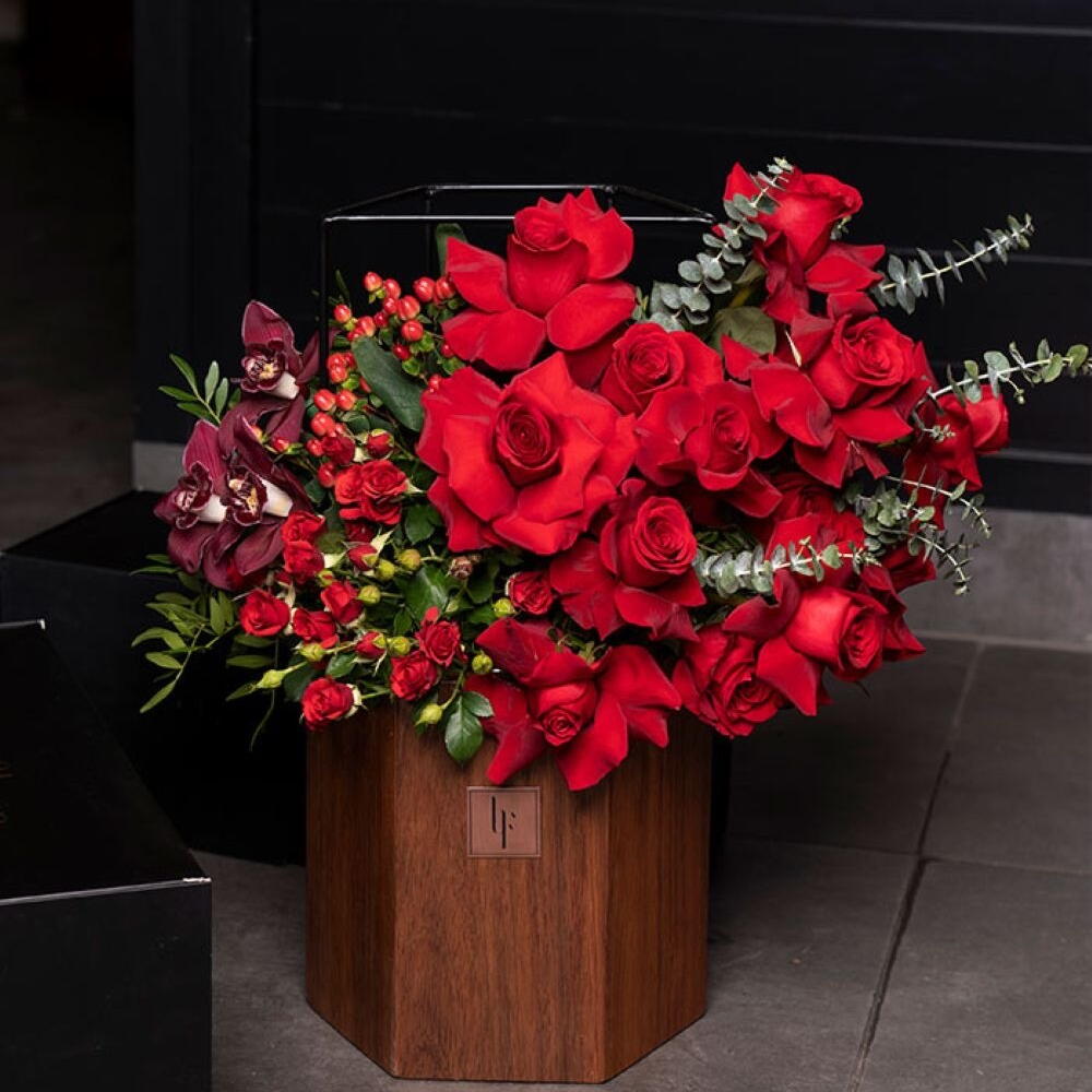 hypericum - 5 pcs spray rose red - 5 pcs cymbidium red - 3 pcs red roses - 15 pcs