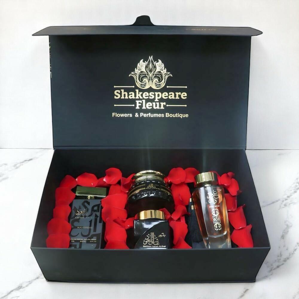 Immerse yourself in the deep, rich aroma of oud with the Ashek Al Oud Luxury Box, the perfect gift for every oud enthusiast. This exclusive Oud Lover Collection is designed to evoke tradition, elegance, and timeless fragrance through an opulent arrangement of premium oud products, beautifully packed and adorned with 40 natural red paper roses for a romantic finishing touch. Whether you are gifting a loved one or treating yourself, this luxurious set is a complete sensory journey that delivers the ultimate oud experience—refined, bold, and unforgettable. Care Instructions: Store perfumes in a cool, dry place away from direct sunlight to preserve their longevity and scent quality. Keep incense in an airtight container when not in use. For the best experience, use bakhoor with a suitable burner and ensure adequate ventilation.