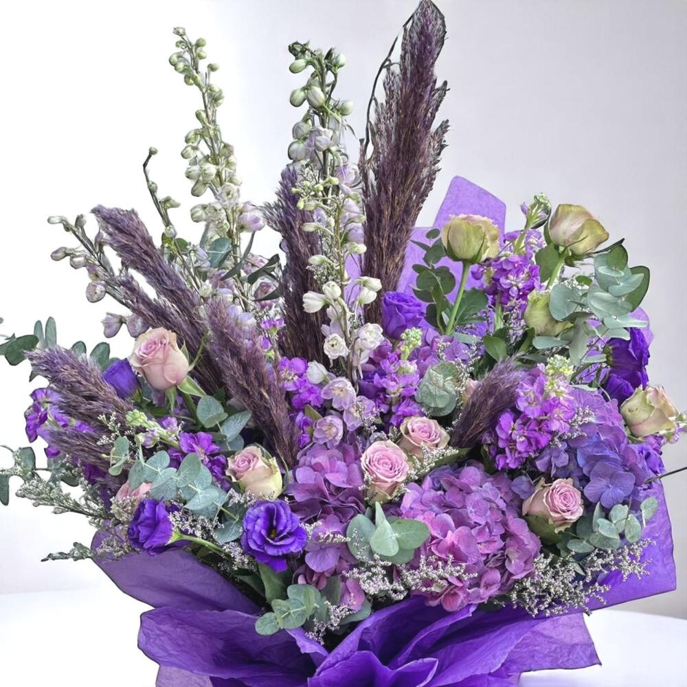 Mystical, bold, and full of depth — this dramatic bouquet in violet, lavender, and plum hues creates a powerful visual statement. A refined blend of purple hydrangeas, lavender stock, lisianthus, and blush roses is complemented by elegant delphiniums, wispy pampas grass, and airy limonium, all wrapped in rich violet paper. Hints of eucalyptus add a fresh contrast to the lush purples, making this bouquet a unique gift for creative souls, anniversaries, or memorable celebrations. To care for the bouquet, trim the stems at a diagonal and place in clean, cool water. Refresh water every two days and keep the arrangement away from heat and sunlight.