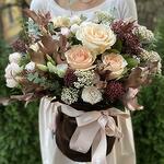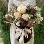 Composition: Rose Kimberli - 3, Ozothamnus - 4, Skimmia - 3, Eucalyptus - 2, Quercus - 5, Spray Rose Reflex pink double colour - 5, Lisianthus - 4, Dianthus - 4, velvet bag - 1, ribbon - 1 Sizes: WIDTH - 45CM; HEIGHT - 36CM; LENGTH - 36CM; (including packaging) Size: 45 x 36 x 36 cm