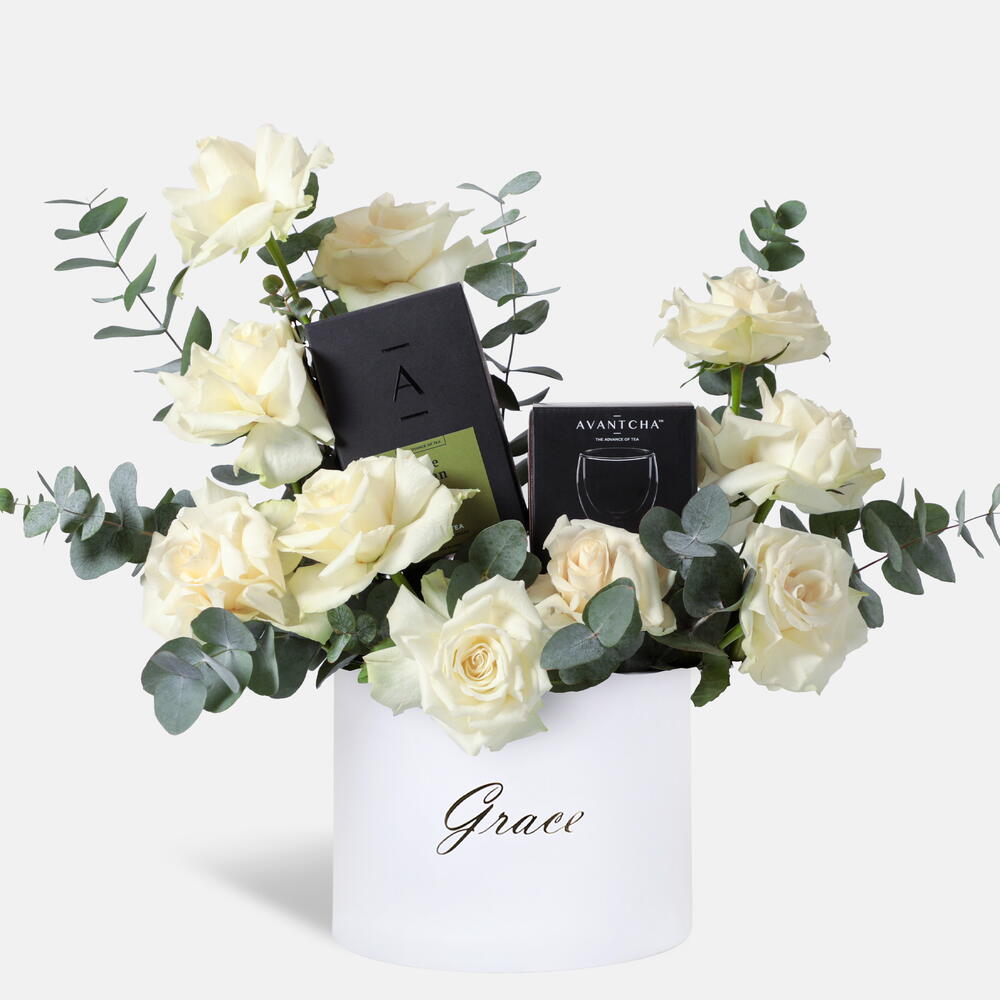 Eucalyptus - 2 pcs white roses - 10 pcs avantcha double wall glass - 150 ml avantcha jasmine mao jian (tea-bag) - 12 pcs