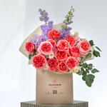 A radiant bouquet of shimmering roses as the centerpiece, delicately accented with lavender delphiniums and fresh eucalyptus—blending luminous beauty with soft, airy elegance.
