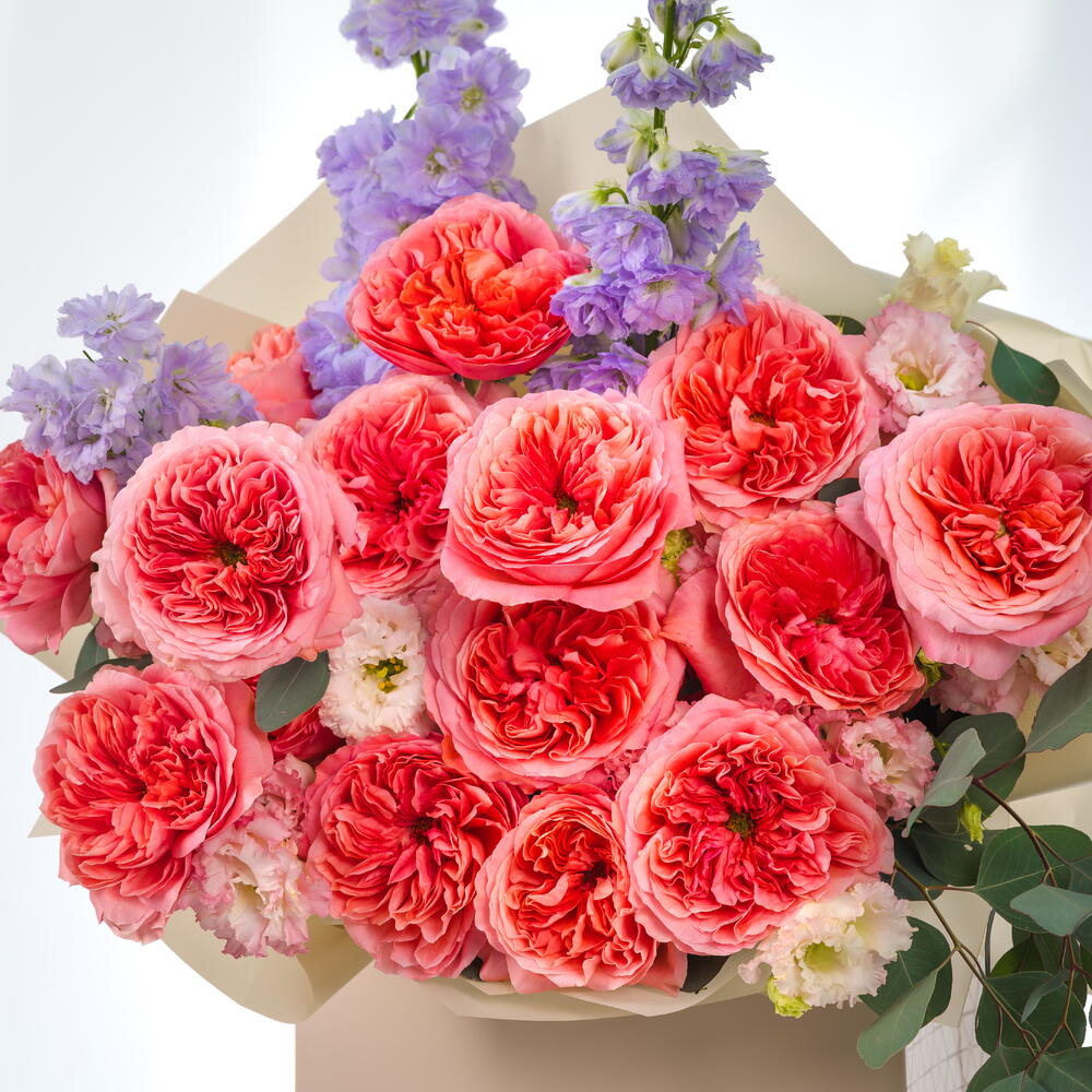 A radiant bouquet of shimmering roses as the centerpiece, delicately accented with lavender delphiniums and fresh eucalyptus—blending luminous beauty with soft, airy elegance.