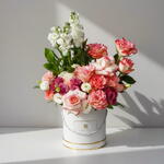 A refined floral arrangement that blends elegance, freshness, and soft romance. Delicate roses in blush, cream, and warm pink tones create a graceful and harmonious composition. Tall white blooms add height and lightness, giving the arrangement a luxurious presence. Fresh greenery enhances the natural beauty and balance of the flowers. Presented in an elegant white hat box with subtle gold accents, it feels timeless and sophisticated. Perfect for anniversaries, celebrations, or heartfelt gifts. This arrangement brings warmth, charm, and understated luxury to any space.