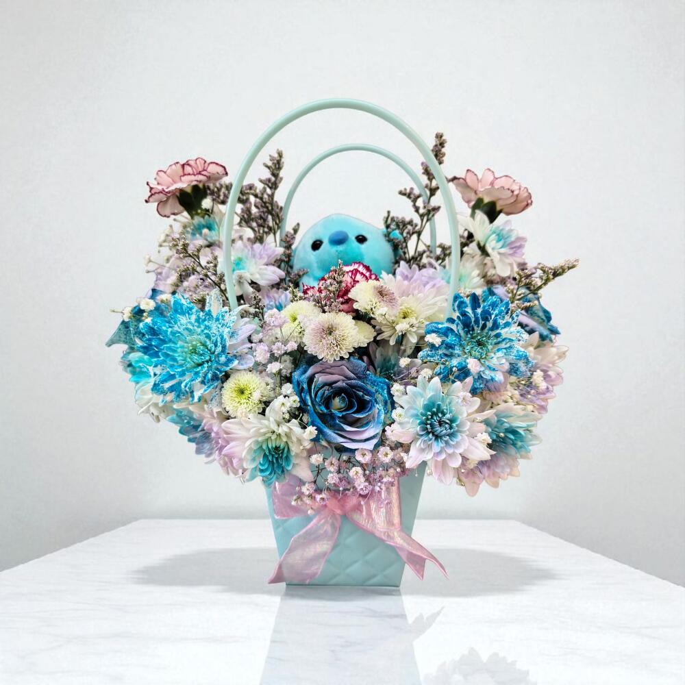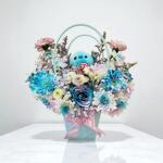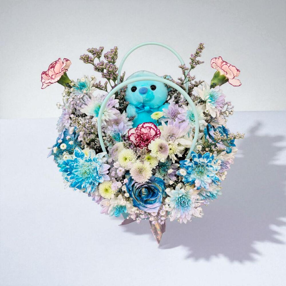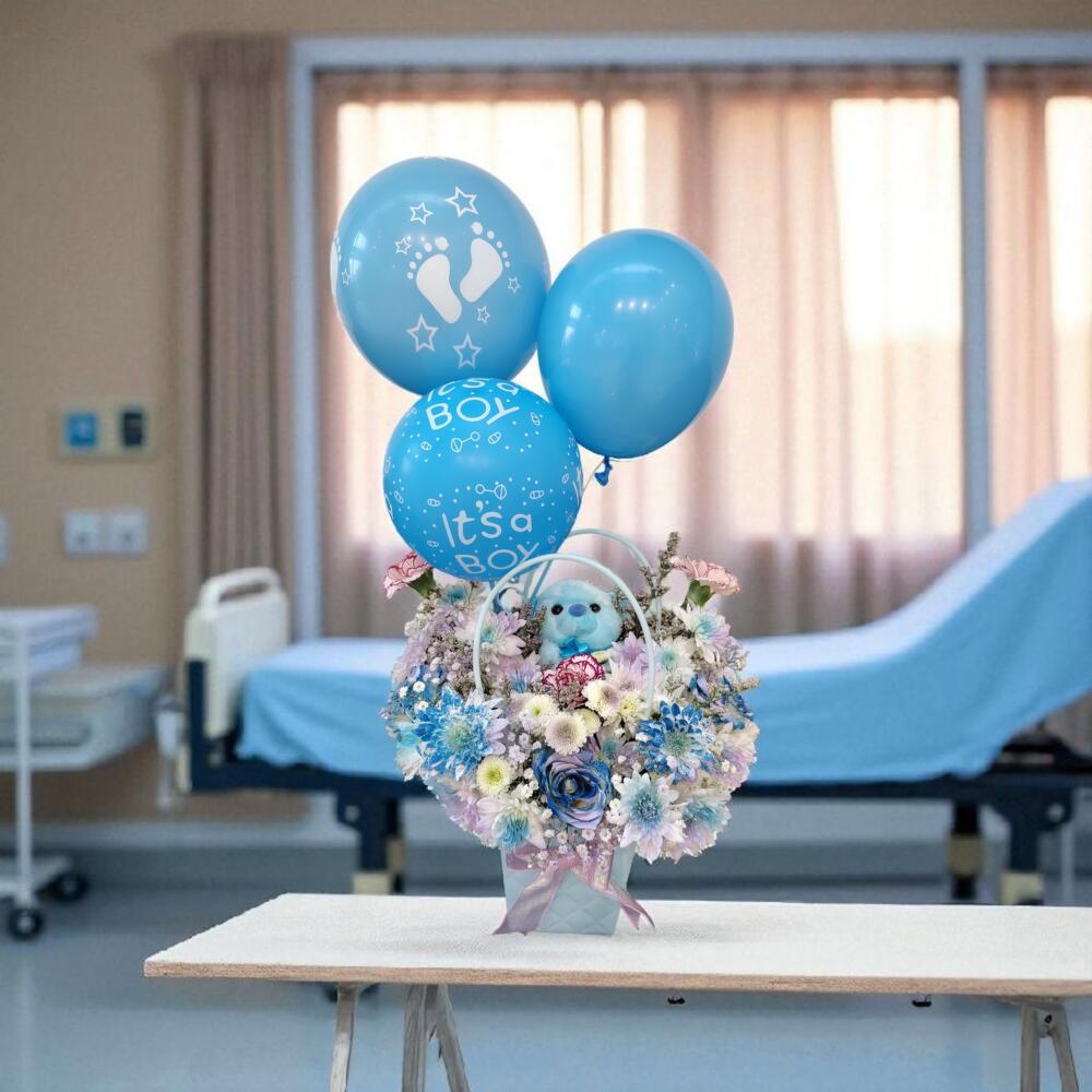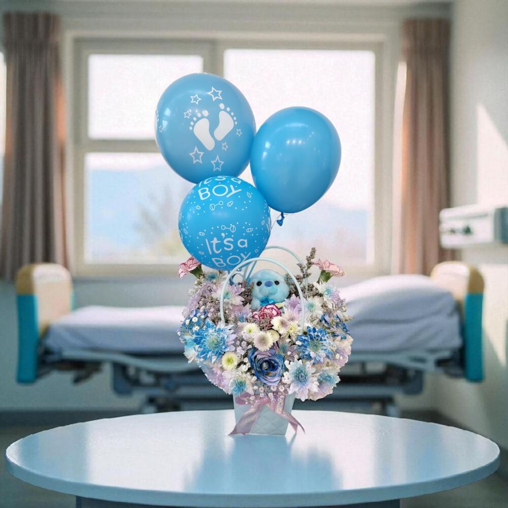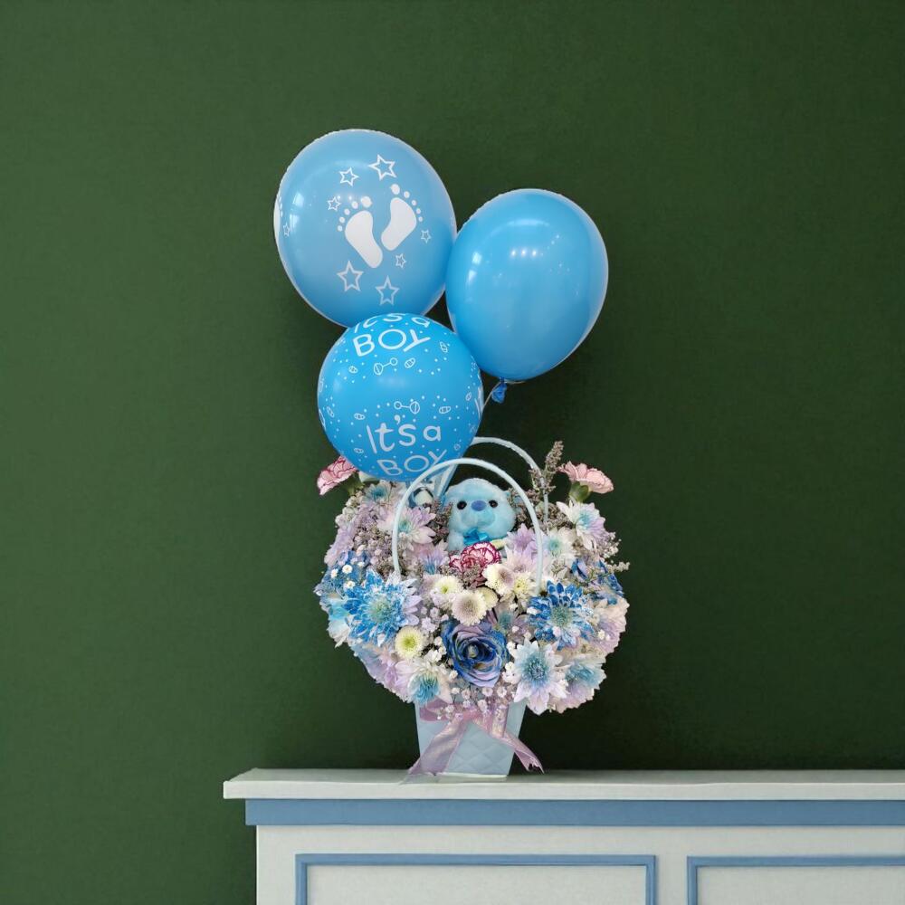 White rose - 5 pcs carnation - 4 pcs helium balloons - 3 pcs chrysanthemum flowers - 6 pcs purple and white pillars - 6 pcs blue teddy bear small - 1 pcs