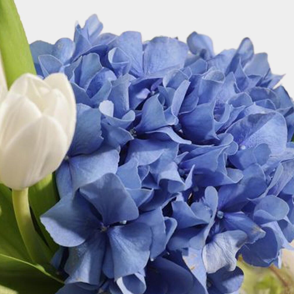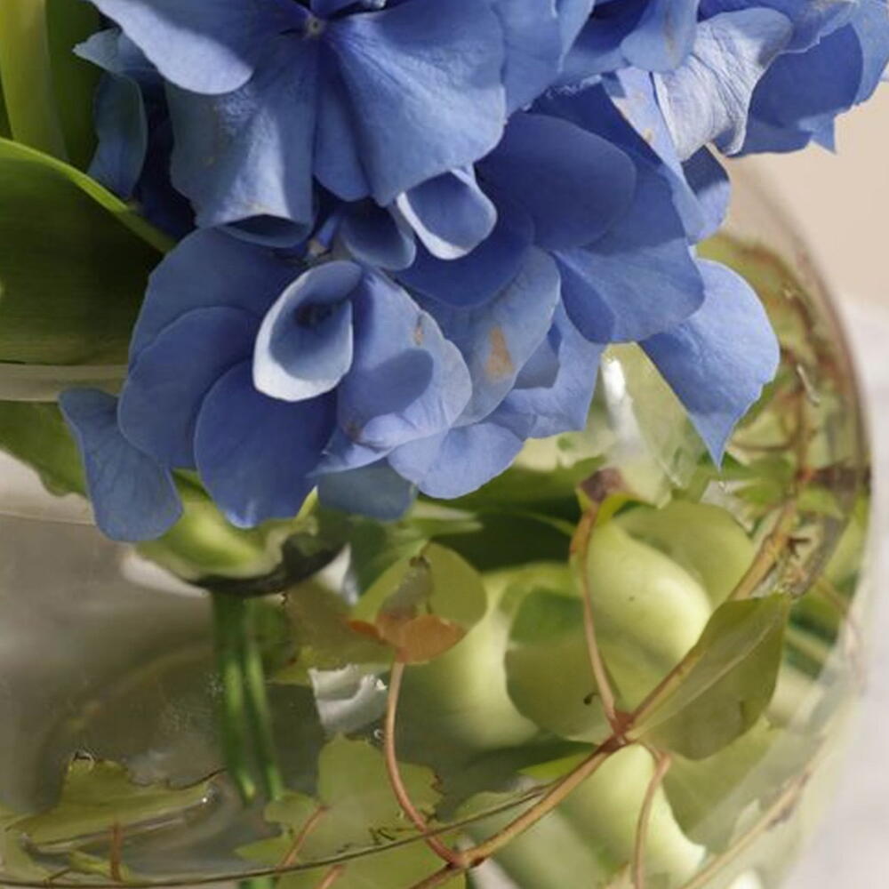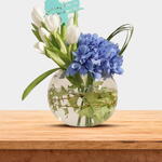 Celebrate with grace using the little star welcome vase, a delicate mix of white tulips and blue hydrangeas in a clear fishbowl, finished with a newborn topper. Ideal for sharing joy and love on a new born baby’s arrival.