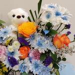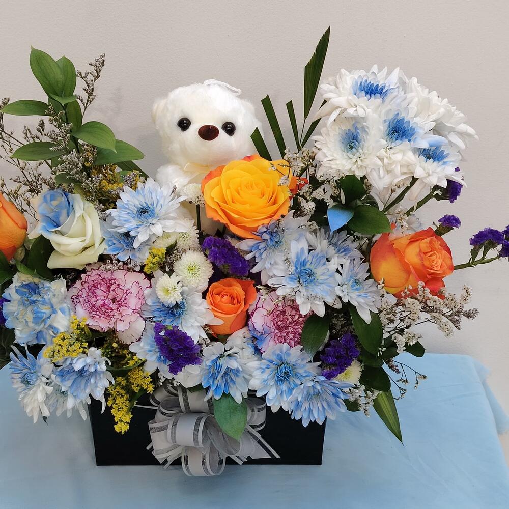 Chrysanthemum - 5 pcs green leaf - 6 pcs mix colour rose - 7 pcs carnation mix colour - 5 pcs mix colour colour fillers - 6 pcs black white pink box available - 1 pcs small taddy bear - 1 pcs