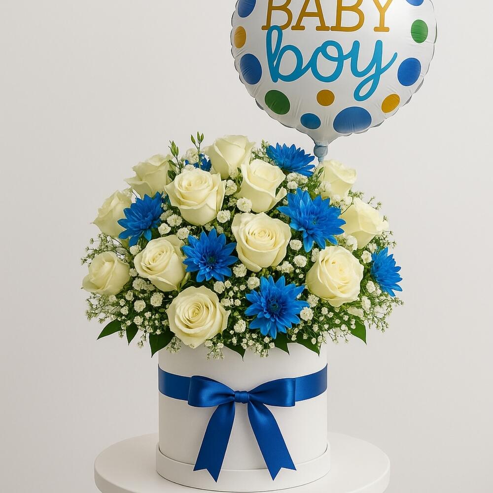 Celebrate the arrival of a precious baby boy with this elegant and joyful floral arrangement. Featuring creamy white roses paired with vibrant blue chrysanthemums and accented with delicate baby’s breath, this bouquet exudes freshness and happiness. Presented in a stylish white hatbox tied with a satin blue ribbon, it also includes a fun “Baby Boy” balloon to mark the special occasion. To prolong freshness, keep the flowers in a cool place away from direct sunlight and heat. Add a small amount of water inside the box every 1–2 days, and lightly mist the blooms. This arrangement is perfect for congratulating new parents at home or in the hospital.