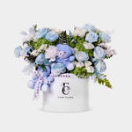 Teddy bear - 2 pcs carnation white - 5 pcs hydrangea green - 1 pcs lisianthus white - 4 pcs spray rose white - 2 pcs round white box - 1 pcs