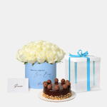 Celebrate the arrival of a baby boy with this charming gift set, featuring elegant white roses paired with a delicious cake, creating a perfect combination of beauty and sweetness