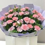 This charming bouquet of pink and two-tone carnations is a tender expression of joy and admiration. The gentle pink tones combined with lush greenery create a harmonious and fresh look. Keep the bouquet fresh by changing the water daily, trimming the stems at an angle, and avoiding direct sunlight and heat sources. Remove any leaves below the waterline to prevent bacterial growth. Ideal for those special moments like birthdays, anniversaries, or any heartfelt occasion, this flower bouquet transcends the ordinary and becomes a tangible manifestation of love. Send it as a birthday gift, express anniversary wishes, convey get well soon sentiments, or simply wish a loving moment to someone dear.