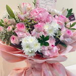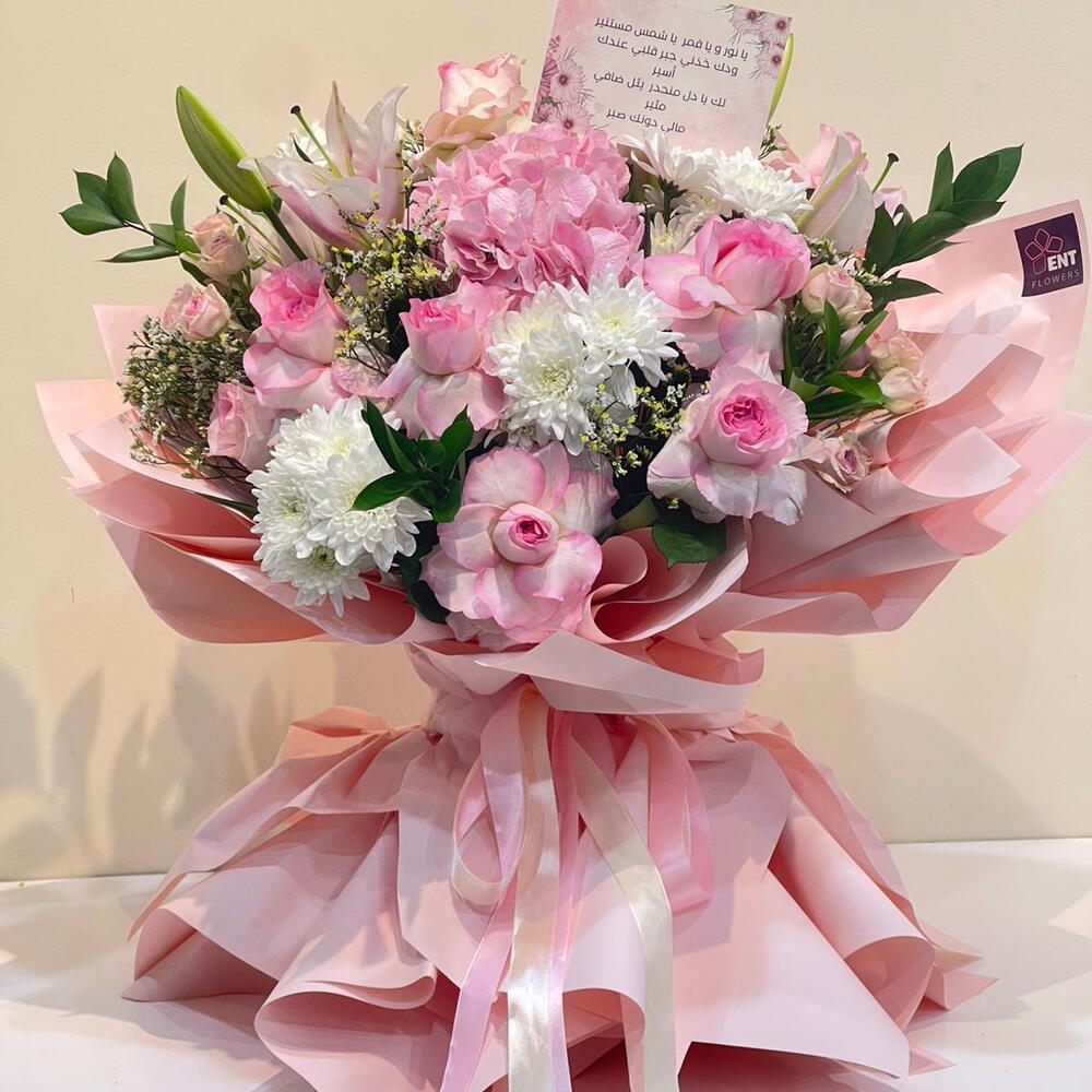 تعتبر هذه الباقة من باقات النوع الواحد تجسيدًا رائعًا للأناقة والجمال. تتألف هذه الباقة الرائعة من قطعة واحدة من الهايدرنجا الوردي الجذاب، 9 قطع من الورد الوردي اللطيف، 2 قطع من الزنبق الوردي المشرق. يضيف 5 قطع من الكريزانتيوم و 4 قطع من الليمونيوم لمسة من الجمال الطبيعي، بينما تضيف 5 قطع من الروسكس لمسة فريدة خاصة. تجمع هذه الباقة بين الألوان الجميلة والروائح الزكية، مما يجعلها الهدية المثالية للمناسبات الخاصة.