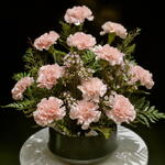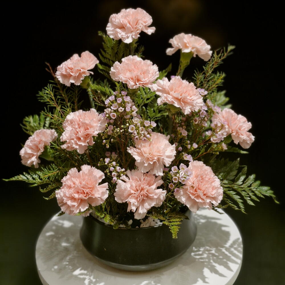 Wax flower - 3 pcs leather leaf - 5 pcs carnation baby pink - 12 pcs vase color black - 1 pcs