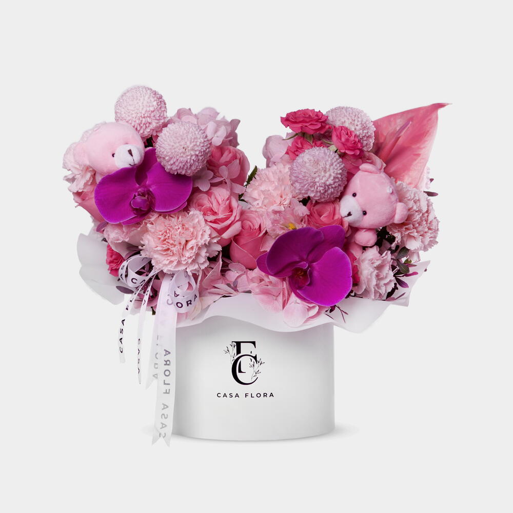 A lovely box arrangement featuring soft roses, spray roses, pink hydrangea, carnations, pin pong, and anthurium, paired with a sweet small teddy bear. A perfect gift to welcome a baby girl with warmth and beauty. Large size box 20cm dimeter X 15cm high