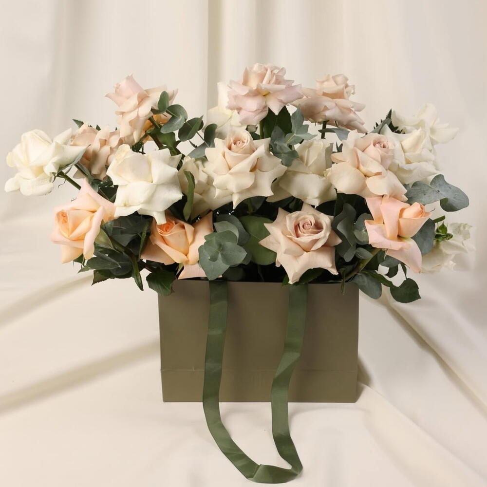 Bag of Happiness – Mixed Roses Eucalyptus in Olive Green Bag Bag of Happiness captures the perfect balance of cheerfulness, elegance, and modern sophistication. Featuring 5 mauve roses, 5 orange roses, and 10 pristine white roses accented with fresh eucalyptus, each bloom is arranged in a luxury olive green bag, creating a bouquet that radiates colorful charm, refined style, and contemporary joy. Perfect for your girlfriend, wife, fiancée, or the woman who brings life to every room, Bag of Happiness is ideal for birthdays, anniversaries, special celebrations, or heartfelt “just because” surprises. Each flower is hand-selected for freshness, vibrant hues, and flawless petals, while the eucalyptus adds soft greenery and aromatic sophistication, making this arrangement a premium floral statement. Send it from a loving partner, devoted husband, or admirer to express joy, admiration, and thoughtful luxury. Bag of Happiness is more than flowers — it’s a poetic, Instagram-worthy gift and a collector-worthy floral experience, available for same-day delivery in Dubai and across the UAE. ✨ Bag of Happiness — because joy fits perfectly in a bouquet.