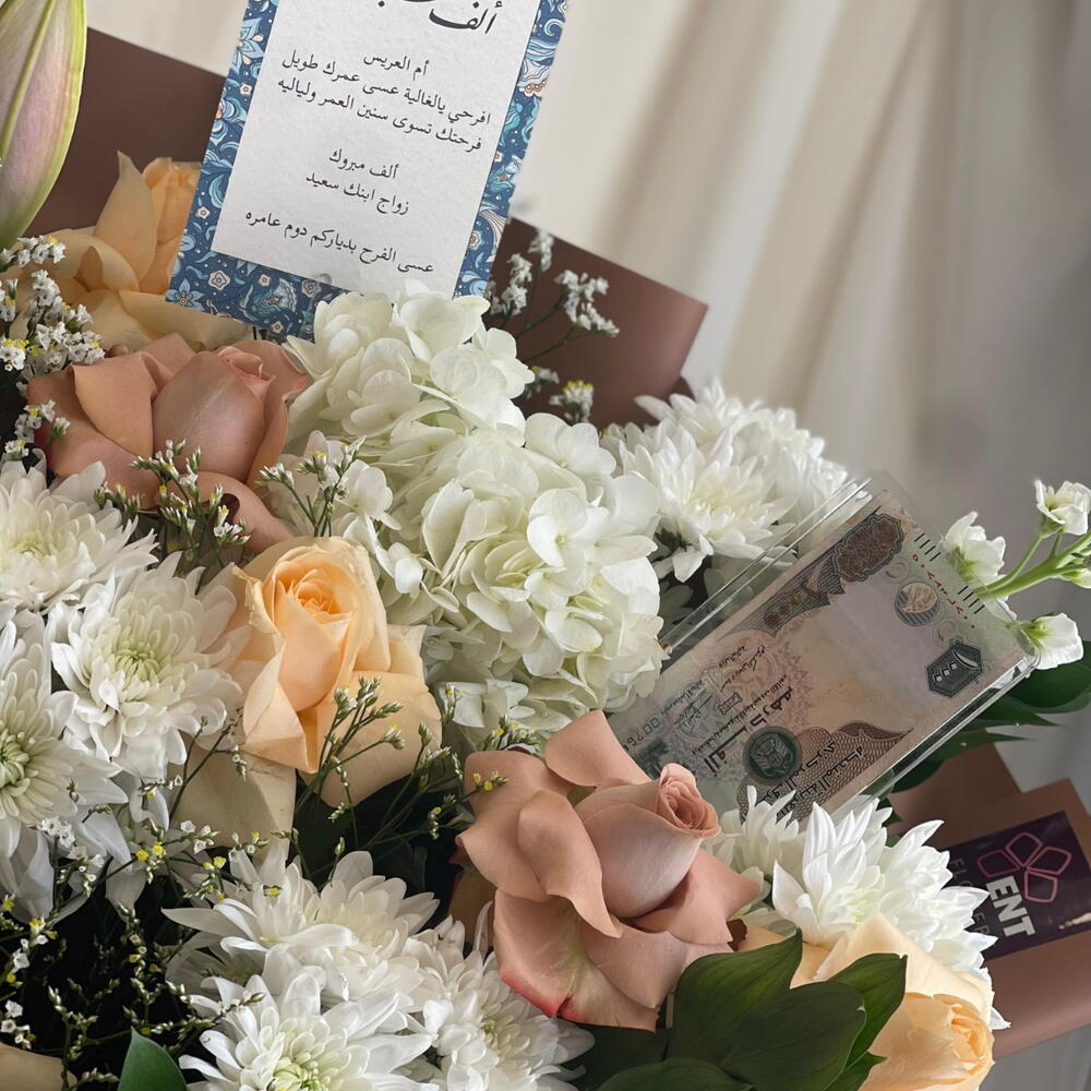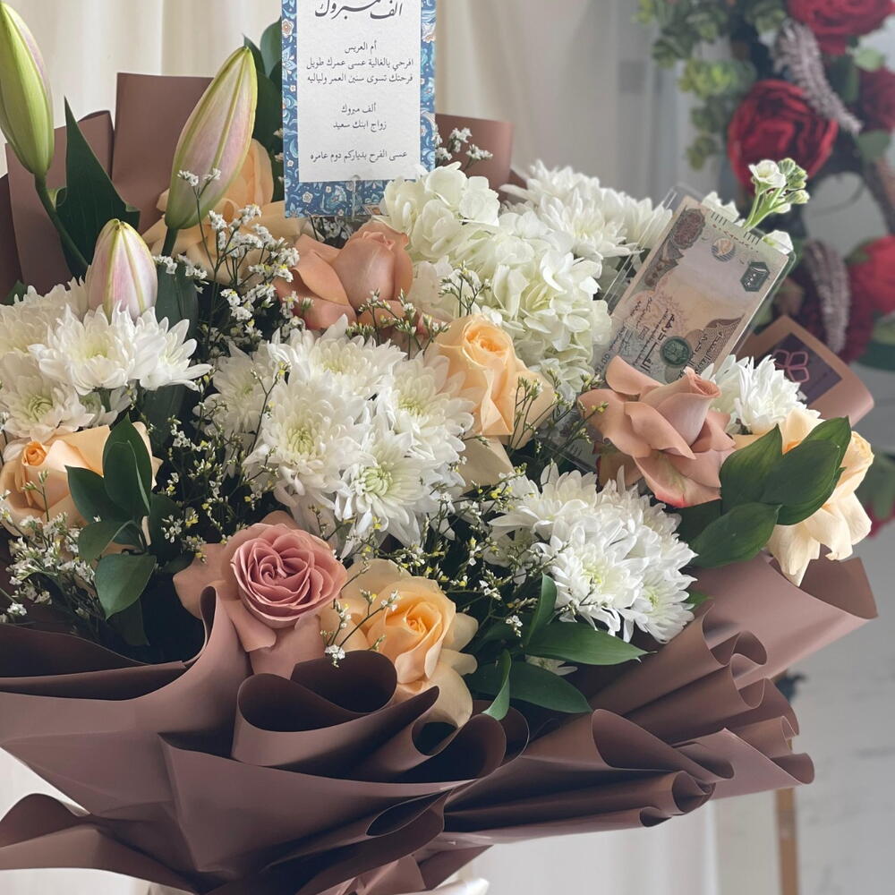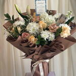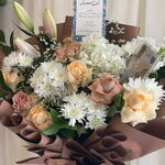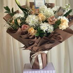 Limonium - 5 pcs mathiola - 1 pcs lily pink - 1 pcs crsathimum - 4 pcs haydrenga white - 1 pcs ruskas - 5 pcs baige rose - 5 pcs dark baige rose - 4 pcs