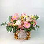 eucalyptus ceneria - 5 pcs alstroemeria pink - 2 pcs gerbera pink mini - 3 pcs chamomile tanacetum - 2 pcs lisianthus pink double color - 5 pcs