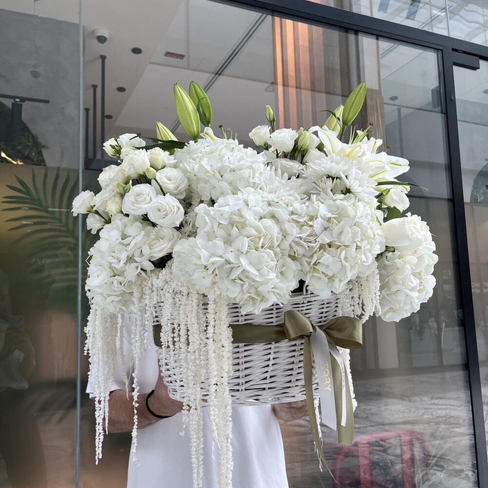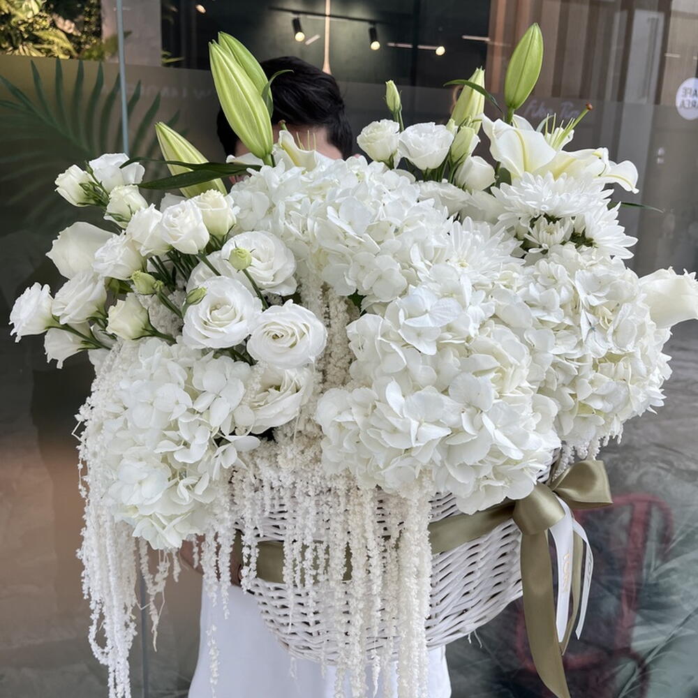 Composition: Hydrangea - 11, Lisianthus - 5, Rose white - 10, Lily Double Oriental - 2, Chrysanthemum spray - 4, Amaranth - 6 Sizes: WIDTH - 65CM; HEIGHT - 50CM; LENGTH - 50CM; (including packaging) Size: 65 x 50 x 50 cm