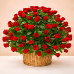 Indulge in a breathtaking spectacle of love and affection with this stunning arrangement of 150 vibrant red roses. Skillfully nestled in a charming basket, these roses guarantee an unforgettable statement of your sentiments. Perfect for any occasion, they promise to make hearts flutter with their radiant beauty. Enjoy an extraordinary presentation of natures most elegant bloom.