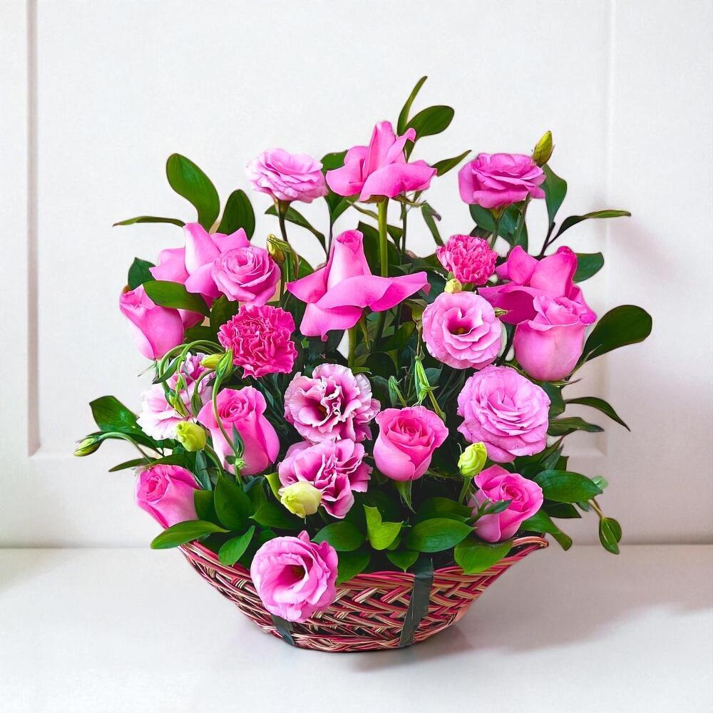 Basket of Pink Blooms – Elegant Pink Roses, Carnations Lisianthus in Woven Basket