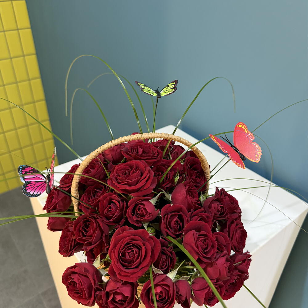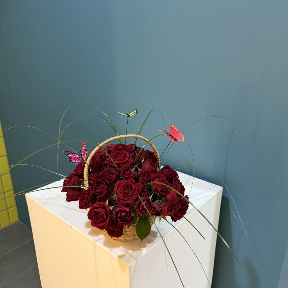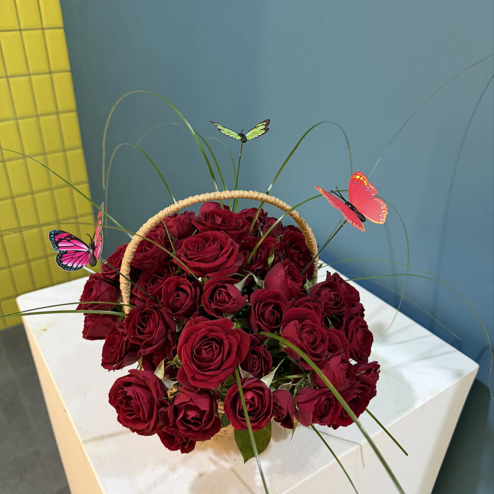 rose spray red - 9 pcs butterfly decor - 3 pcs bear grass - 10 pcs basket hand made - 1 pcs