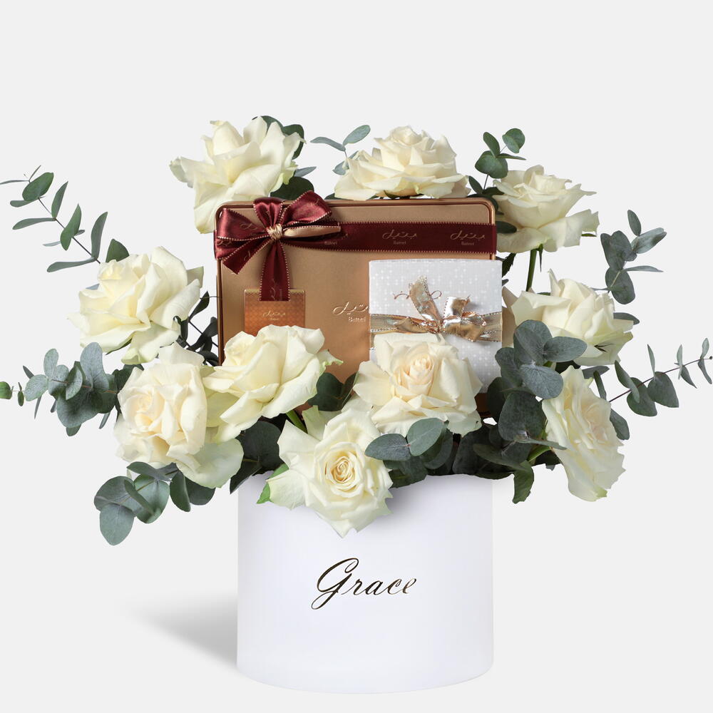 Eucalyptus - 2 pcs white roses - 10 pcs bateel assorted biscut tin can - 350 g