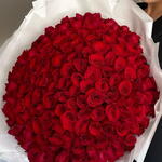 a large, luxurious, hand-tied bouquet of red roses, The flowers are arranged in a dense, rounded shape and are wrapped in white paper, presented on a white surface.