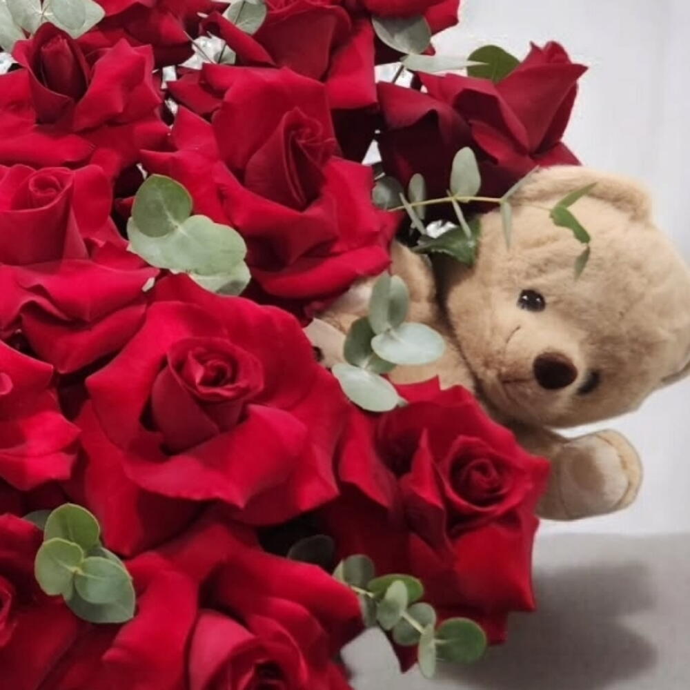 Teddy bear - 2 pcs black box - 1 pcs red classic roses - 51 pcs