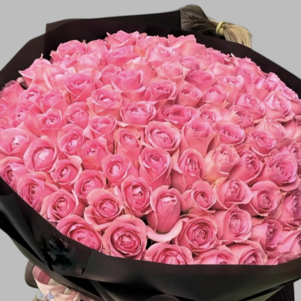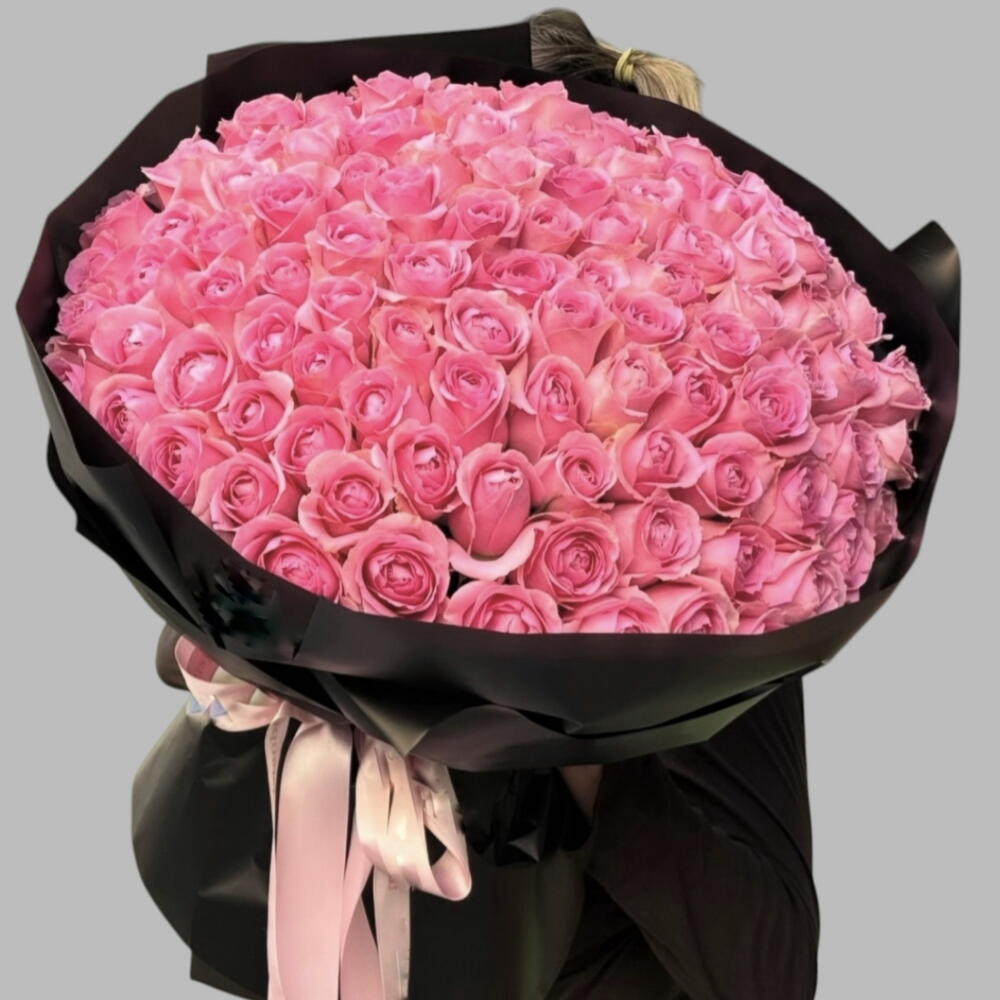 Flowers: The bouquet consists of numerous pink roses, which are often associated with appreciation, pure love, femininity, and grace. Wrapping: The arrangement is elegantly wrapped in black paper, which provides a striking contrast to the soft pink hues of the roses. Ribbon: A light pink ribbon is tied around the base of the wrapping to secure the bouquet.