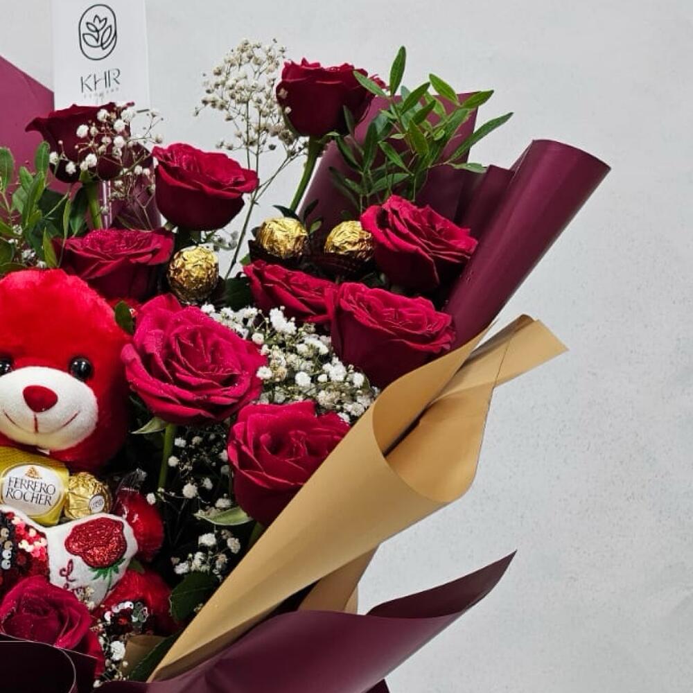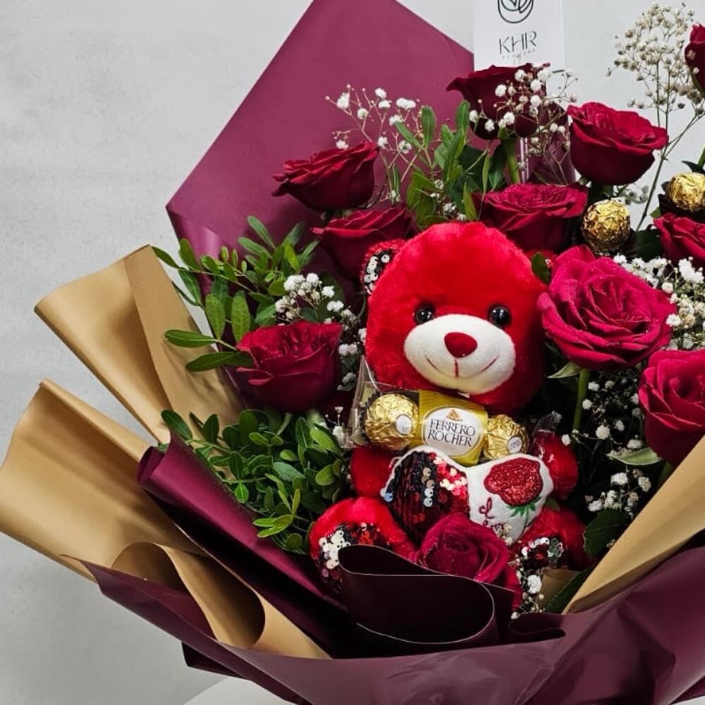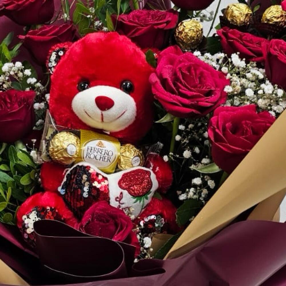 Red rose - 15 pcs Green leaves - 4 pcs gipsophila - 5 pcs ferrero chocolate - 6 pcs bear toy - 1 pcs