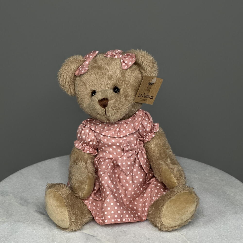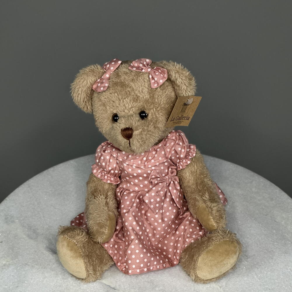 Dusty Rose Dot Bear is a hand-stitched teddy dressed in a muted rose-pink frock sprinkled with tiny cream polka dots and finished with a satin neck bow—channelling vintage storybook charm. Her cloud-soft plush invites hugs, while a lace-trimmed collar and puffed sleeves lend heirloom sweetness that brightens any setting.