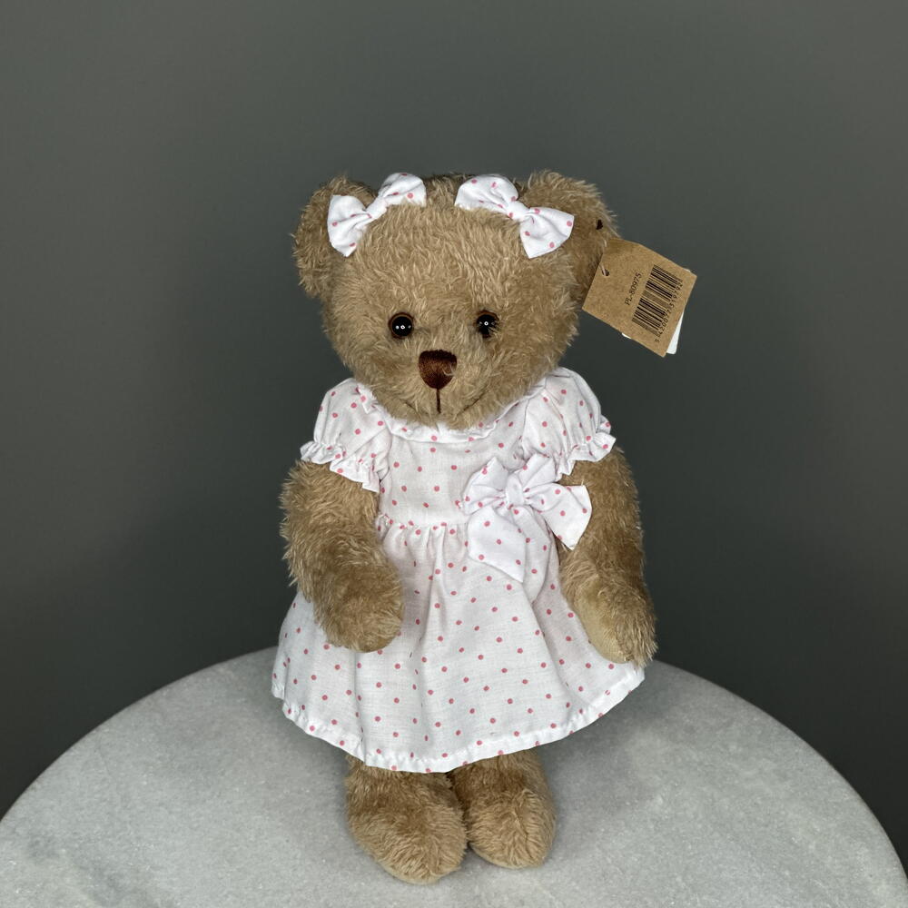 Pink Polka Charm Bear is a hand-stitched teddy dressed in a bubble-pink cotton frock sprinkled with crisp white polka dots and finished with a satin bow—a playful nod to candy-shop nostalgia. Her marshmallow-soft cream fur invites hugs, while ruffled sleeves and a tiny heart patch add storybook sweetness.