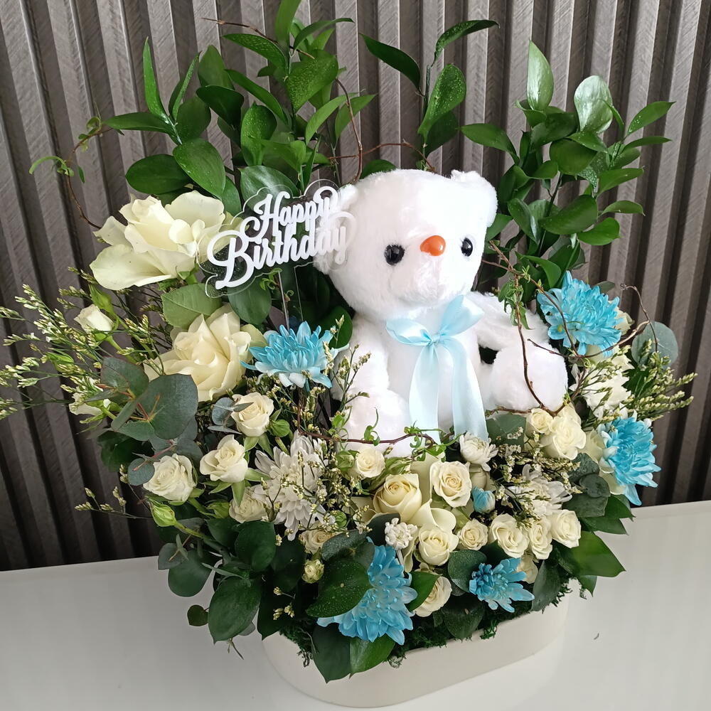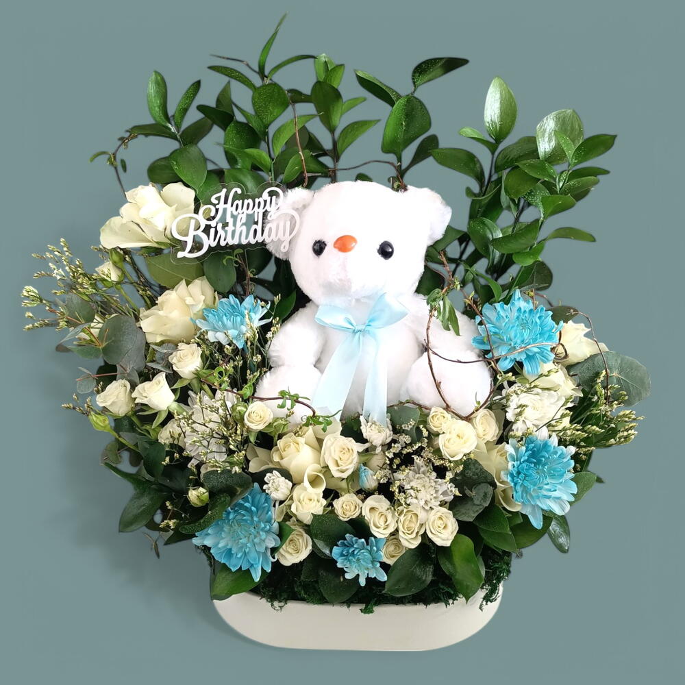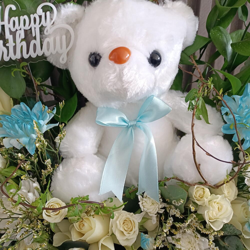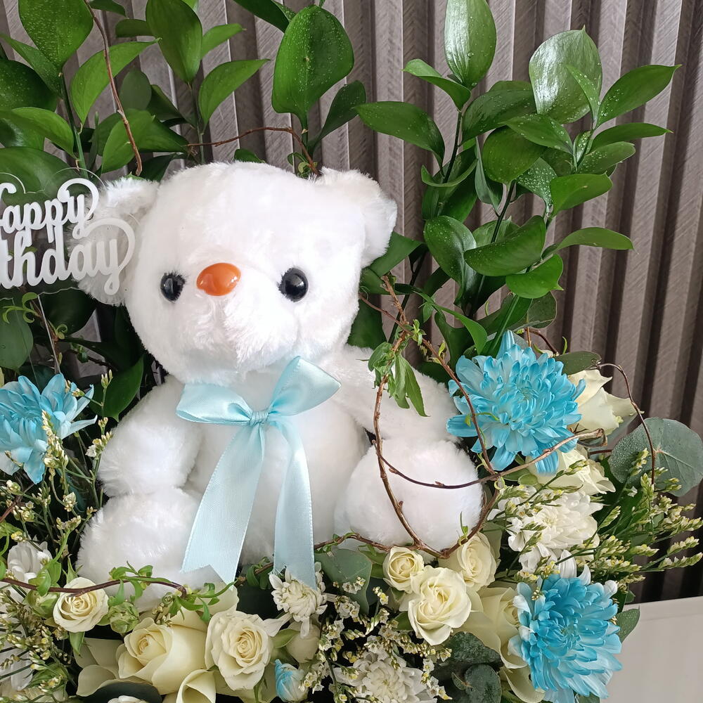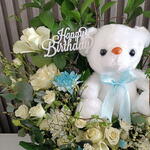 Celebrate a special birthday with our delightful Bear Hug Birthday Blooms arrangement. This heartwarming design features a cuddly white teddy bear nestled amongst a beautiful array of fresh flowers. The soft hues of white roses and delicate blue blooms create a serene and joyful atmosphere, perfect for conveying your warmest birthday wishes. Lush greenery adds a touch of natural elegance, making this arrangement a truly memorable gift. The Happy Birthday pick adds the perfect finishing touch, making it a sweet and thoughtful gesture for any age.